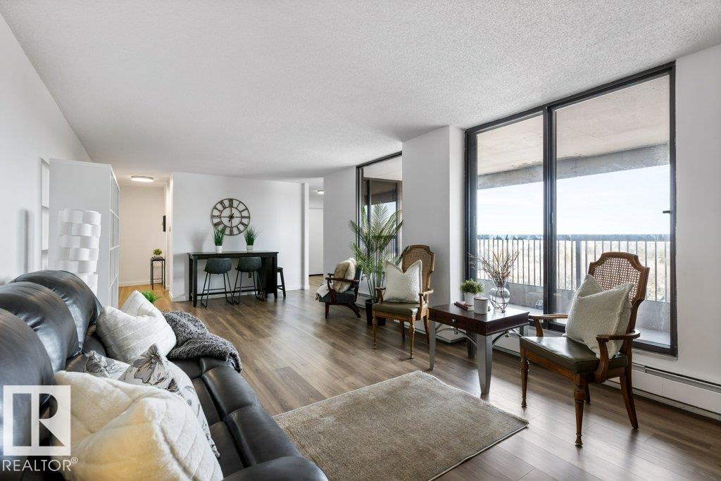 Welcome to River Park Place! This beautiful 2 bedrm, 2 bath unit offers 1100+sq ft of completely renovated space. UPGRADES incl all new flooring, cabinets, counters, SS appliances, closets, bathrms, laundry & more! Large CORNER unit w/ 2 balconies, RIVER VIEWS, tons of natural light, open concept dining/living, spacious walk-thru kitchen & large pantry/storage. Enjoy the convenience of HEATED UNDERGROUND parking, updated FITNESS room & common/social rm. The unique ROOF TOP patio is spectacular, offering panoramic river valley & downtown views, w/ private/sheltered areas for you to gather & socialize. This a very well-maintained, secure, CONCRETE building. Literally steps from river valley walking/ biking trails & dog park. Easy access to downtown core, Commonwealth Stadium, Riverside Golf, shopping & groceries. LRT station is only 2 blocks away so commuting to UofA & MacEwan is a breeze. Whether you're a first-time buyer, student or investor, this is affordable, worry-free living in the heart of the city.