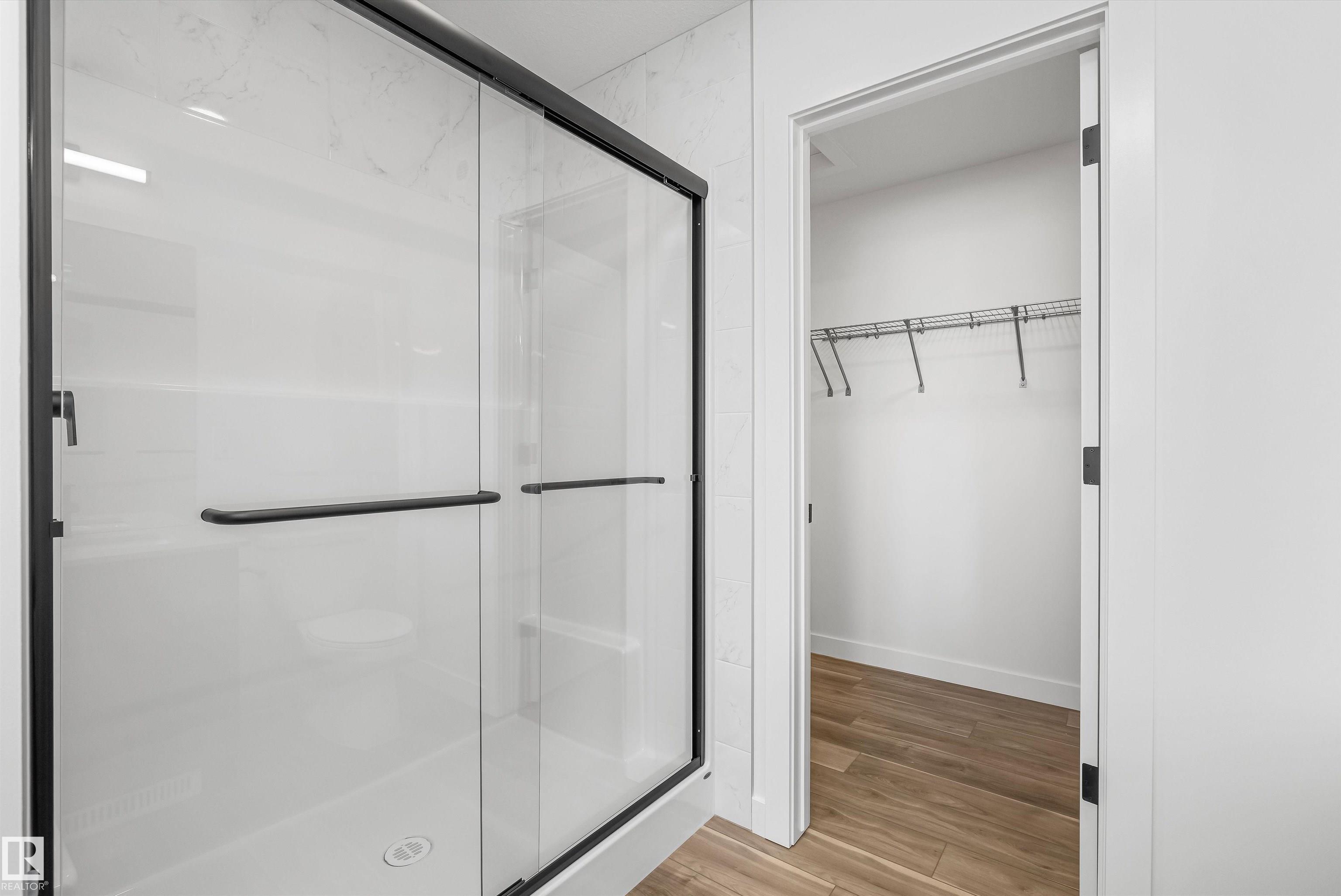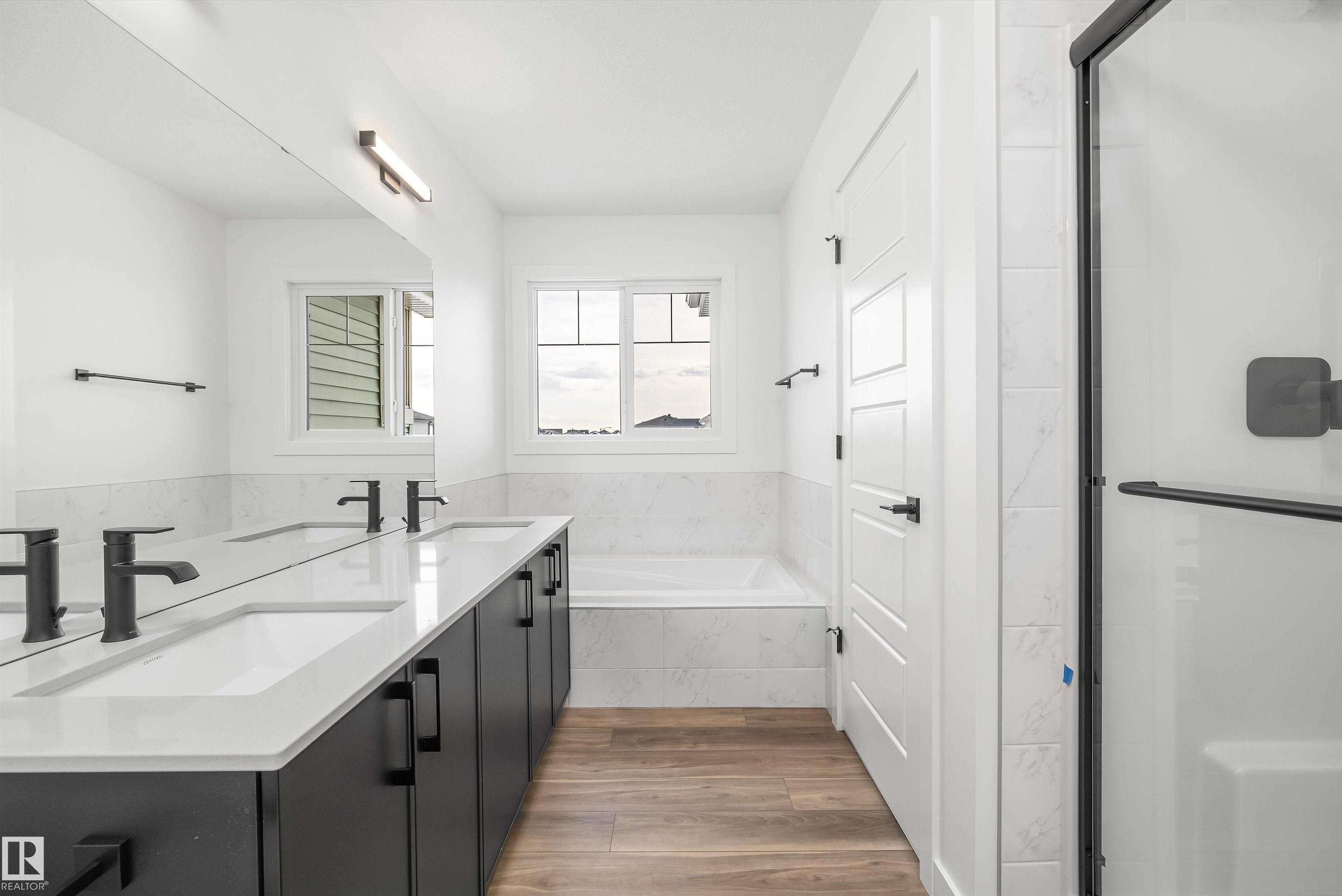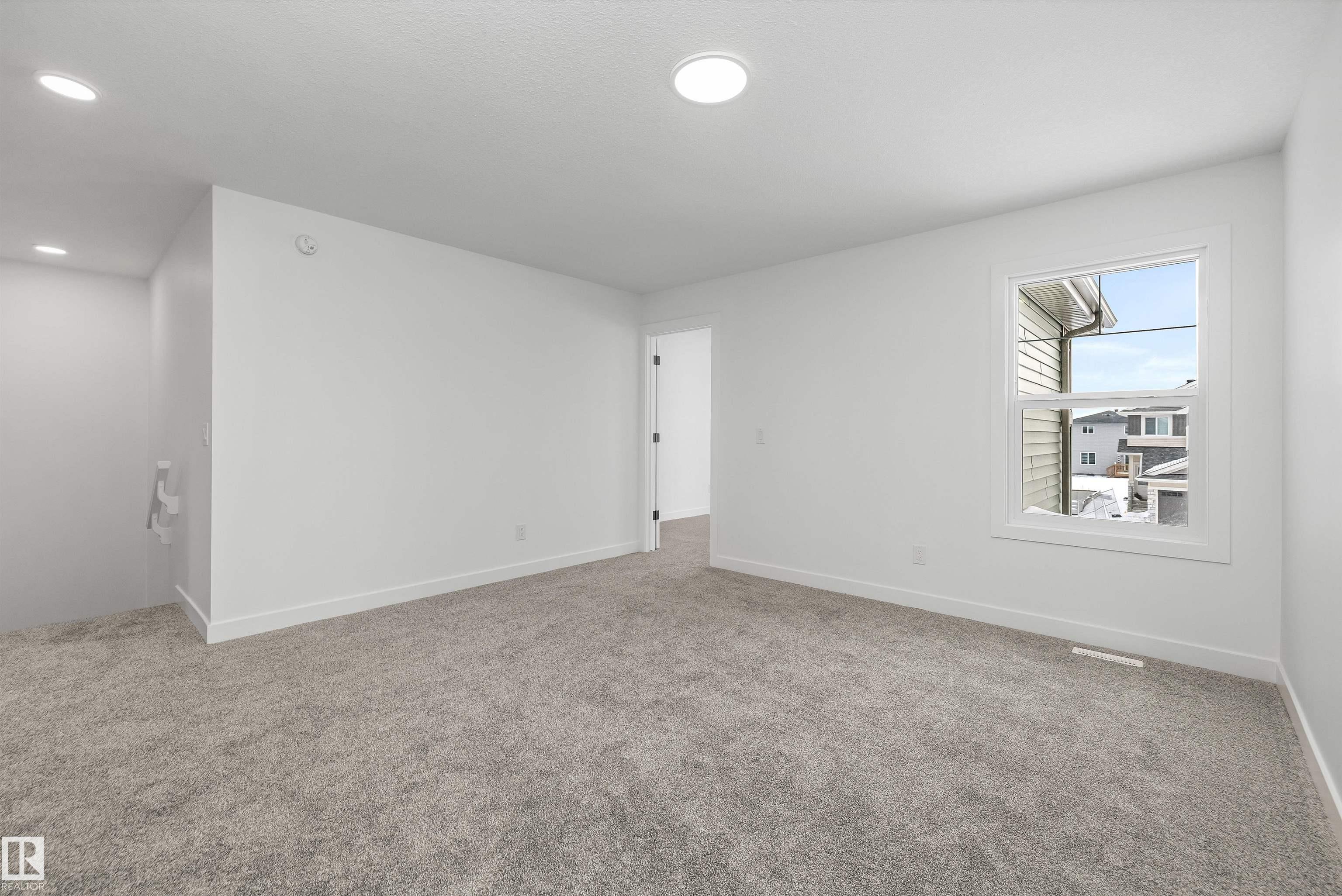 Built by Sterling Homes, this beautifully finished front-attached home in College Woods at Lakeview blends modern design with natural serenity. Triple pane windows and 9' ceilings brighten the main floor, where a welcoming foyer leads to a versatile den and convenient half bath. The open layout flows into the great room with a cozy fireplace and a stunning kitchen featuring quartz countertops, a large island, ceiling-height cabinetry with crown moulding, modern hood fan, built-in microwave, and pantry. Oversized windows and a patio door connect to the backyard. Upstairs, the primary suite offers a spa-like 5-piece ensuite with double sinks, soaker tub, glass shower, and walk-in closet access. A central bonus room, full bath, upper laundry, and two bedrooms add flexibility. Finished with luxury vinyl plank flooring, side entrance, upgraded railings, double attached garage with floor drain, and basement rough-ins, this home delivers style and comfort in a peaceful, nature-inspired community.