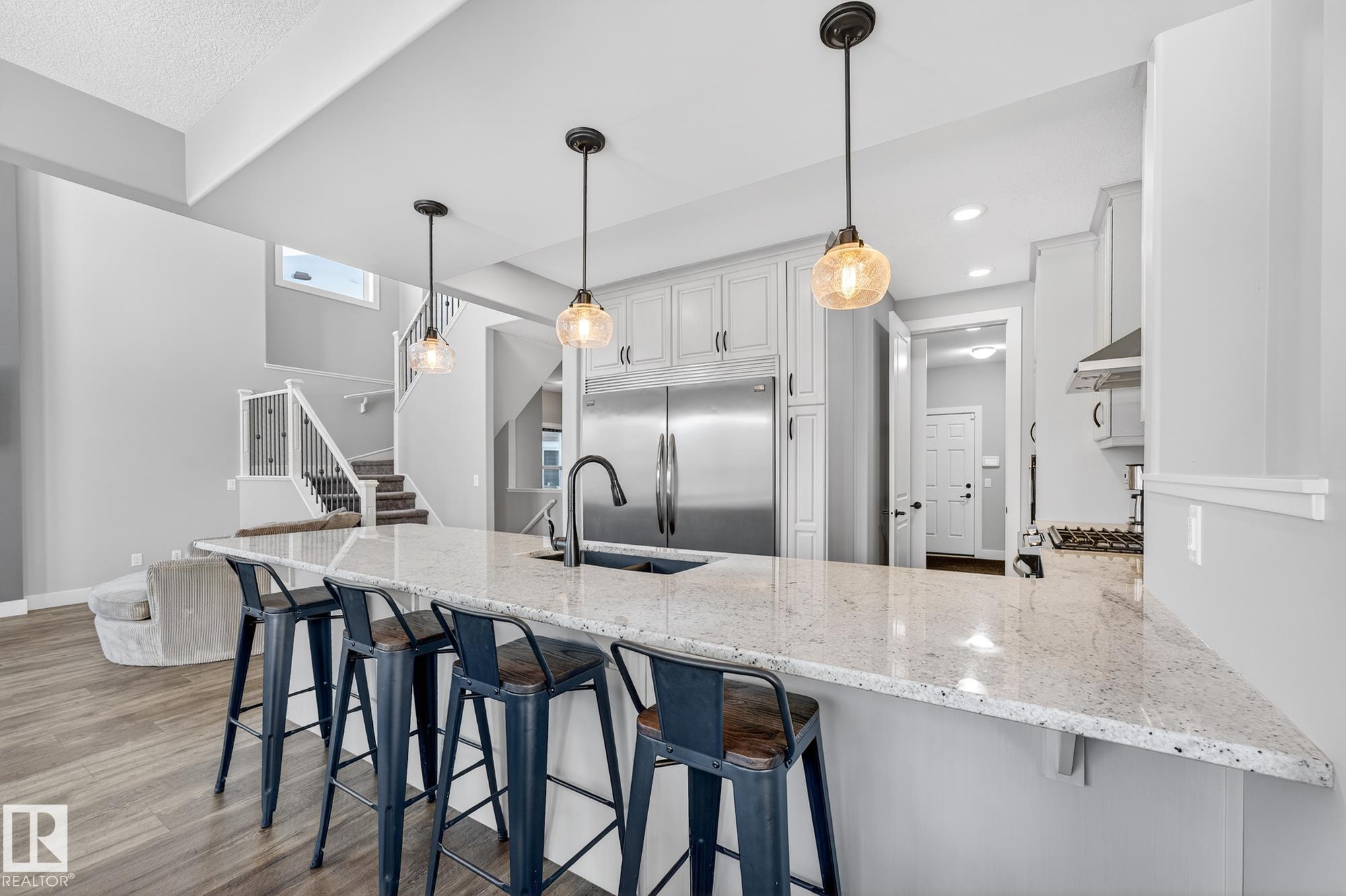 Exceptional quality meets an unmatched lifestyle in the sought-after community of Summerside. Stunning 5-bedroom, 3.5-bath home backs directly onto green space w/a walking path leading to the private clubhouse, exclusive lake access w/year-round amenities & a vibrant social scene. The open-to-above living room features oversized windows, a triple-slide patio door, flooding the home with natural light. The chef's kitchen impresses with custom, ceiling-height cabinetry, quartz countertops, gas stove, commercial fridge/freezer combo, convenient walkthrough pantry & mudroom w/custom built-ins. Upstairs, the spacious primary retreat offers a walk-in closet & heated floor, spa-inspired ensuite, alongside three additional bedrooms, a full bath & laundry. The fully finished basement adds even more living space. Enjoy the landscaped yard with deck, hot tub, BBQ hookup & irrigation. Additional highlights include air conditioning, hot/cold bibs, heated triple garage with tandem parking & floor drain. Make your move!