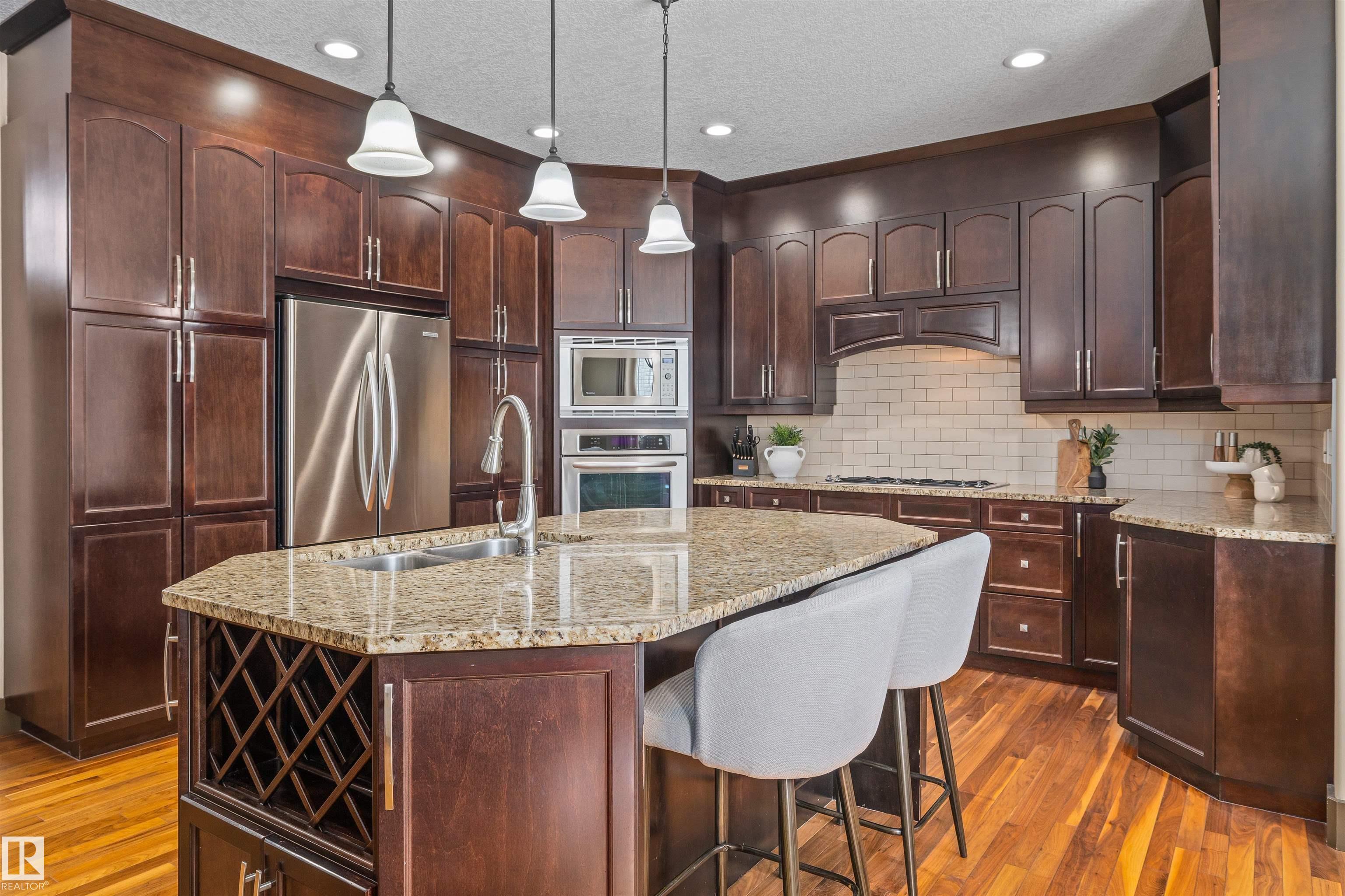 A Stunning Family ready home in Copperwood in west Edmonton featuring 5 bedrooms and 3.5 bathrooms plus a fully finished basement and a main floor den. A bright open foyer to the second level creates an airy first impression. The main floor offers open concept living with a kitchen featuring a built in wall oven with dark espresso cabinets and a center island. Enjoy built in speakers and a cozy living room with a gas fireplace. Upstairs is a vaulted bonus room adding extra space for the family. The spacious primary suite has large walk in closet and a lux 5 pc ensuite plus 3 additional bedrooms on the upper level, a rare layout ideal for larger families. The finished basement adds a 5th bedroom with its own ensuite, perfect for teens or guests who want privacy. Enjoy a double attached garage and a landscaped backyard. Located near parks, ponds, schools and everyday amenities with extensive walking trails and quick access to 215 Street, Whitemud Drive and Anthony Henday for easy commuting across Edmonton.