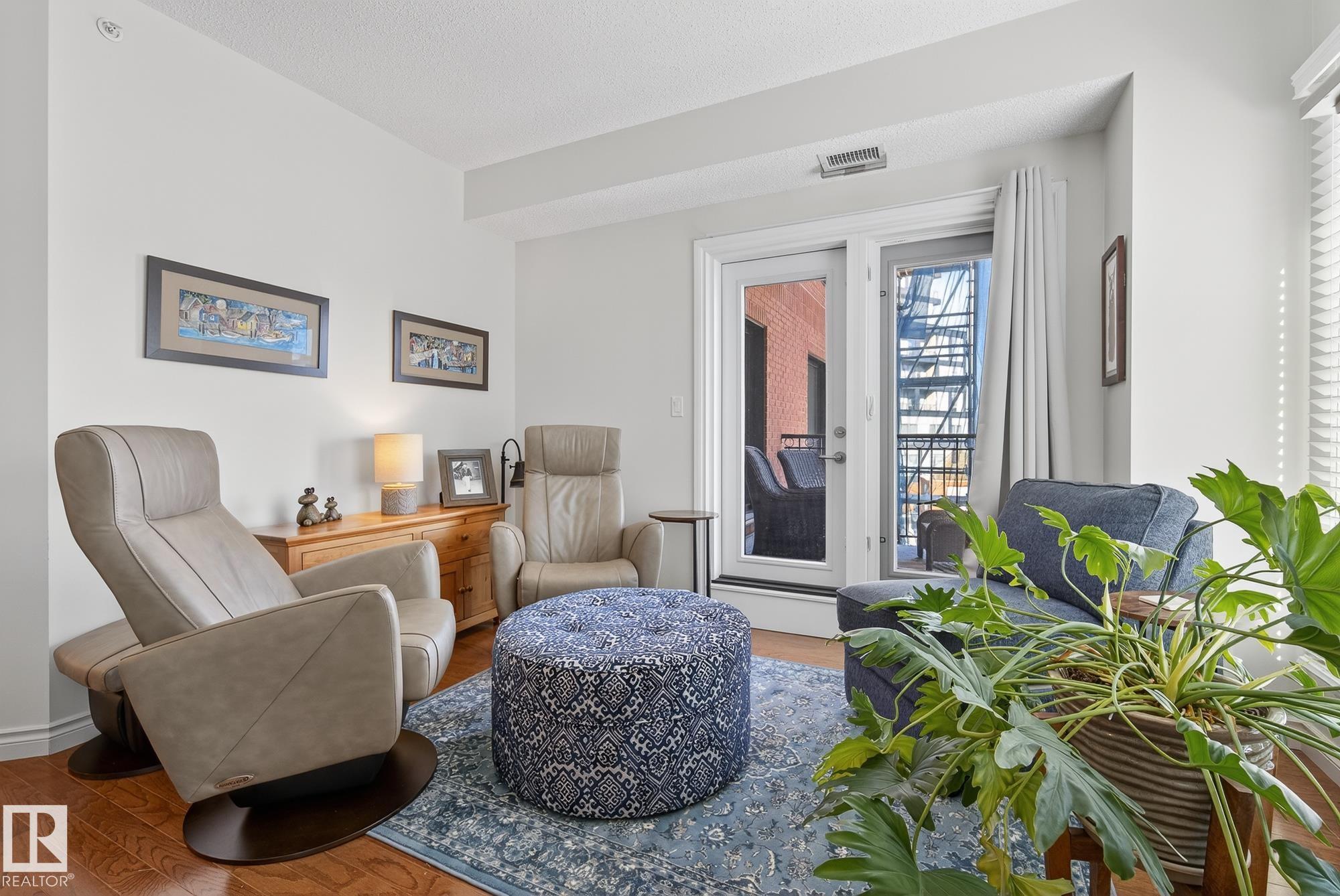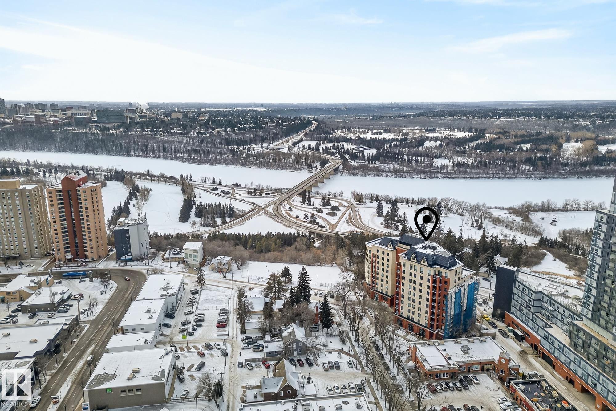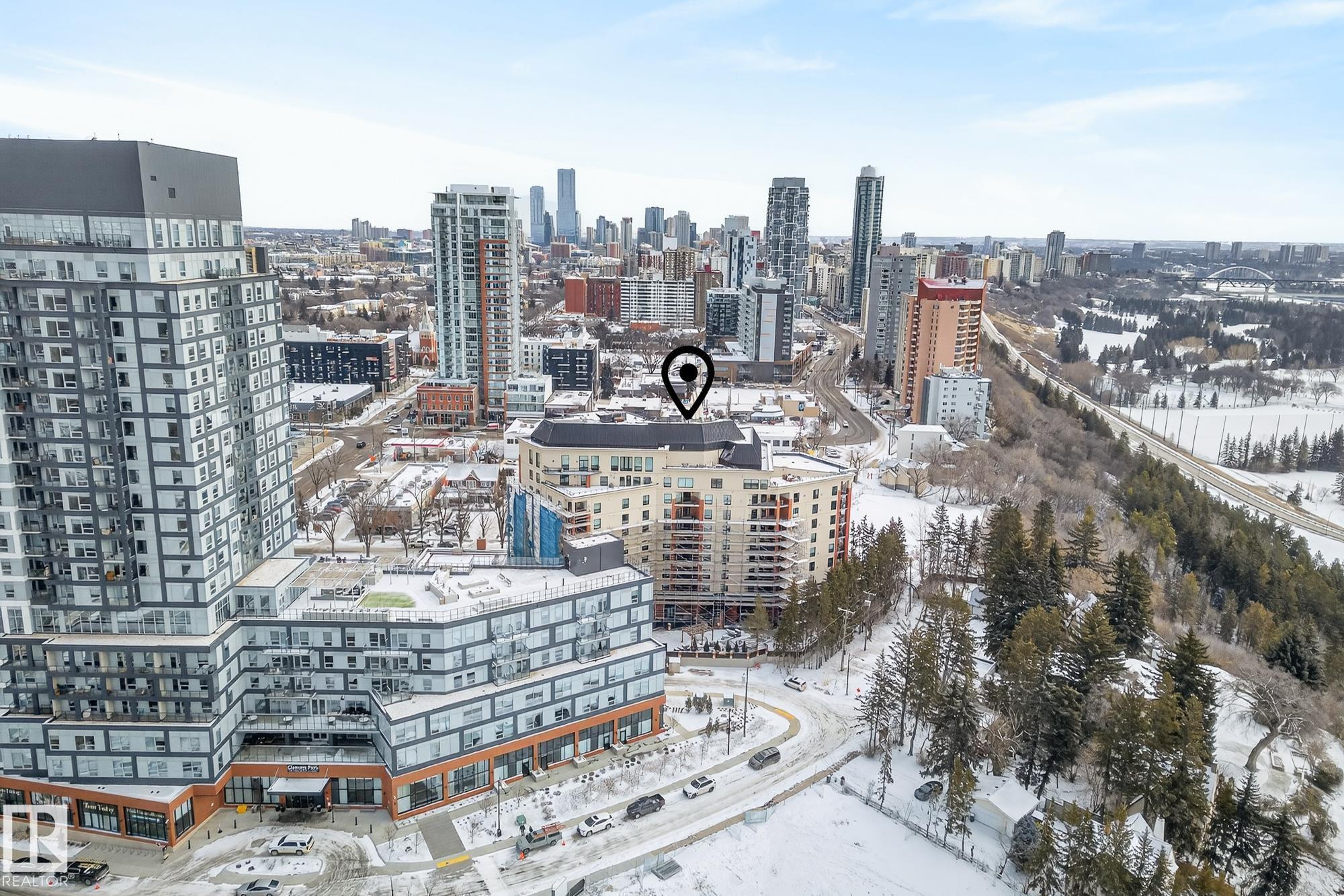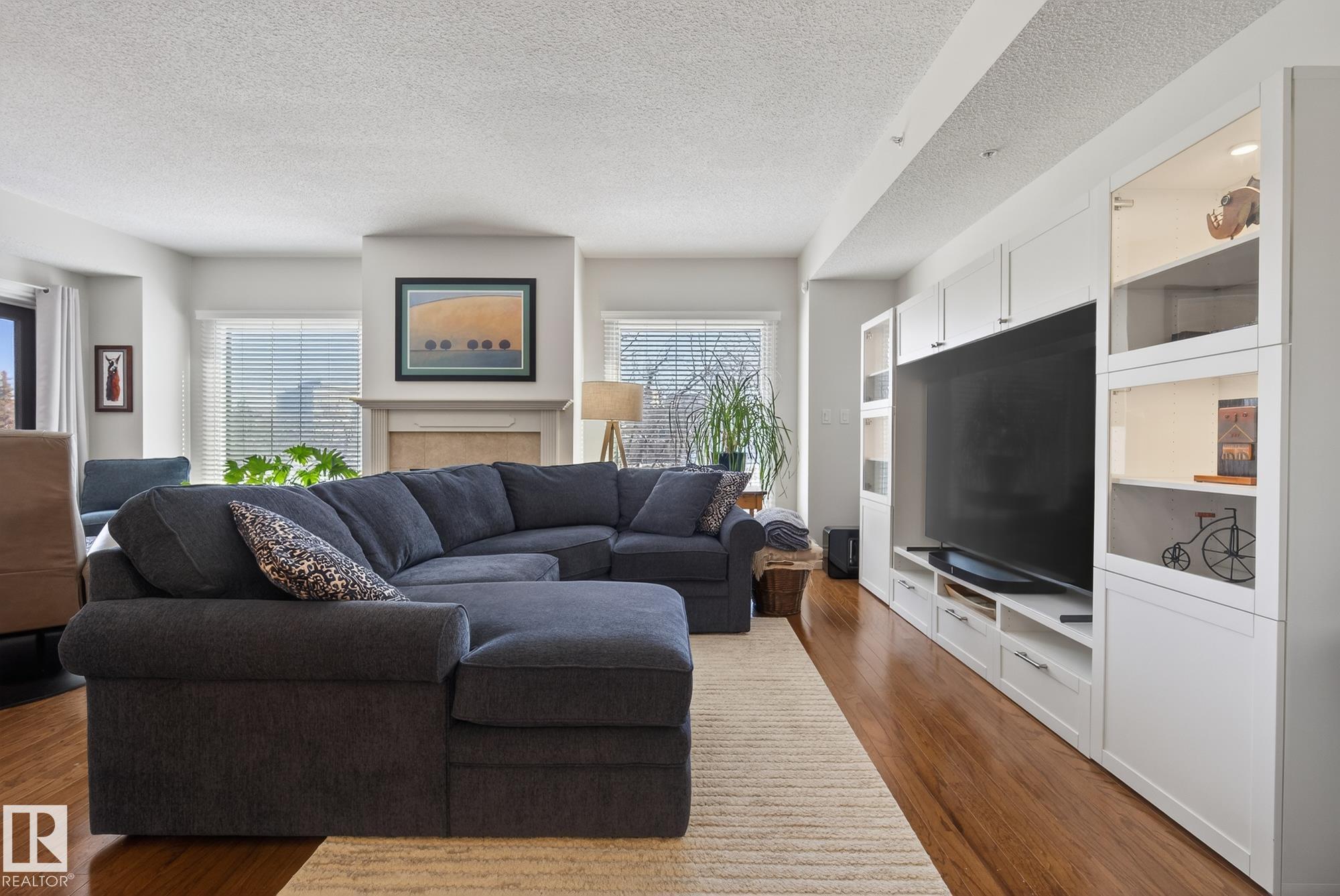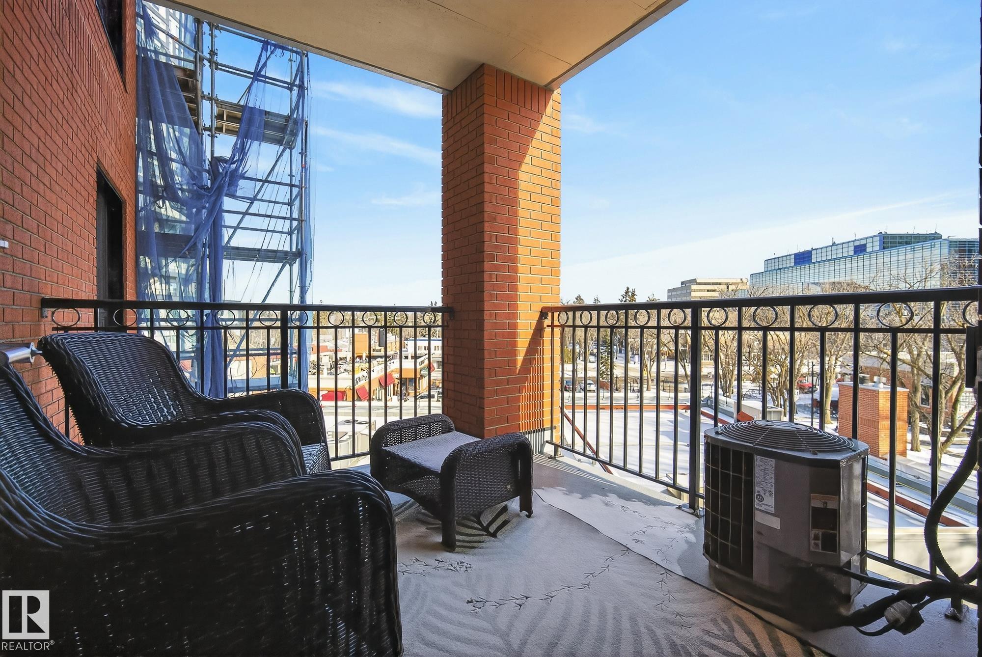 Steps from the River Valley and vibrant 124 Street, welcome to Properties on High Street--one of Edmonton's most sought-after downtown condo buildings. This bright and spacious 1,380 sq. ft. east-facing corner unit offers 2 bedrooms and 2 bathrooms with beautiful views of tree-lined streets and the downtown skyline. Large windows fill the home with natural light, complementing the 9 ft. ceilings, hardwood and tile flooring, and cozy gas fireplace. The beautifully finished kitchen features granite countertops, classic white shaker cabinetry, and eat-up bar. The generous primary suite includes a spacious ensuite, while the second bedroom is ideal for guests or a home office. Enjoy central air conditioning and relaxing or entertaining on the private covered balcony with gas BBQ hookup. This well-managed, pet-friendly building offers an exercise room, courtyard patio, onsite caretaker, and heated underground parking. A rare opportunity to enjoy spacious downtown living in a premier location.