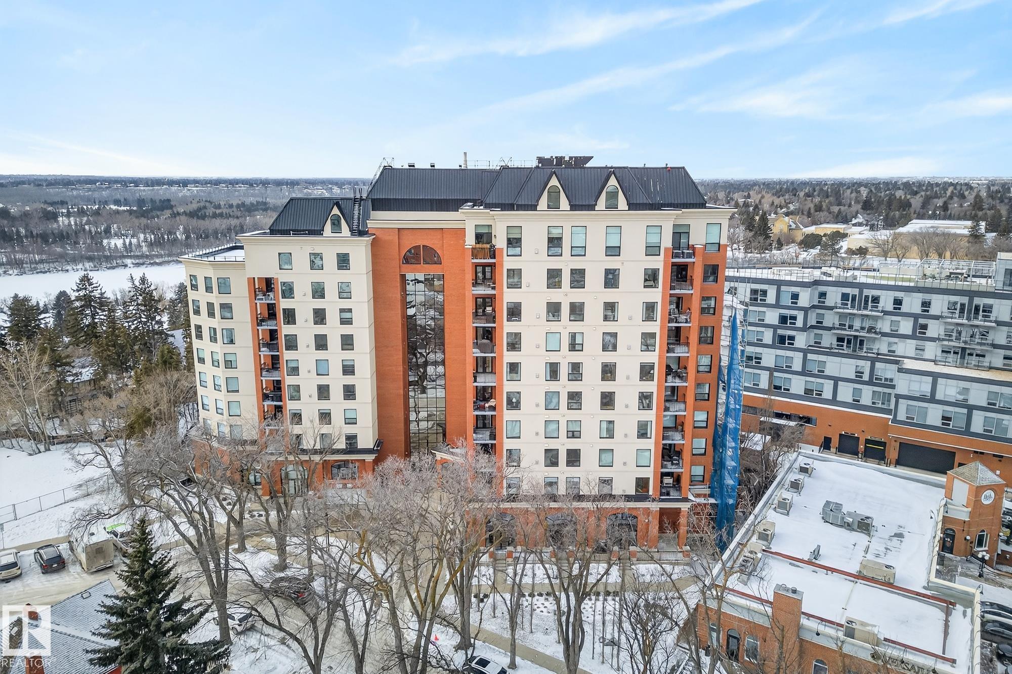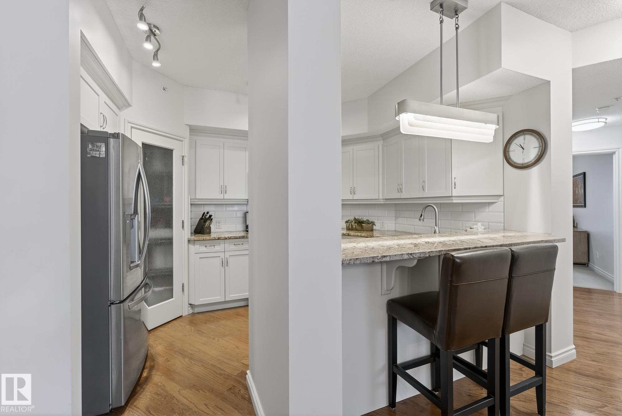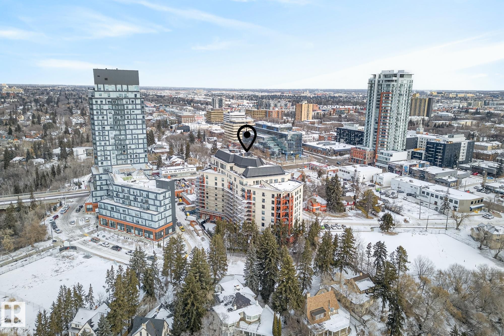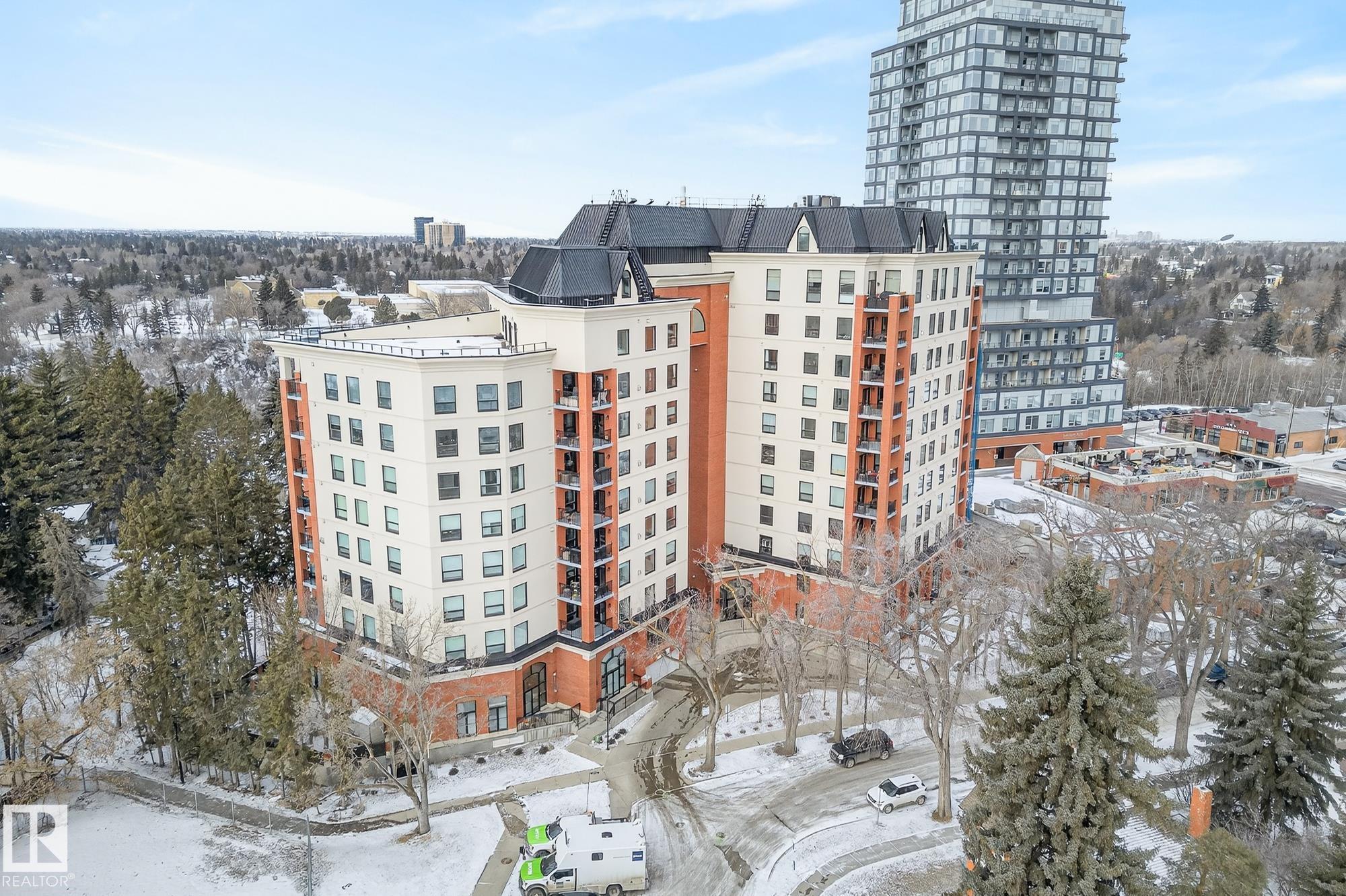 Steps from the River Valley and vibrant 124 Street, welcome to Properties on High Street--one of Edmonton's most sought-after downtown condo buildings. This bright and spacious 1,380 sq. ft. east-facing corner unit offers 2 bedrooms and 2 bathrooms with beautiful views of tree-lined streets and the downtown skyline. Large windows fill the home with natural light, complementing the 9 ft. ceilings, hardwood and tile flooring, and cozy gas fireplace. The beautifully finished kitchen features granite countertops, classic white shaker cabinetry, and eat-up bar. The generous primary suite includes a spacious ensuite, while the second bedroom is ideal for guests or a home office. Enjoy central air conditioning and relaxing or entertaining on the private covered balcony with gas BBQ hookup. This well-managed, pet-friendly building offers an exercise room, courtyard patio, onsite caretaker, and heated underground parking. A rare opportunity to enjoy spacious downtown living in a premier location.
