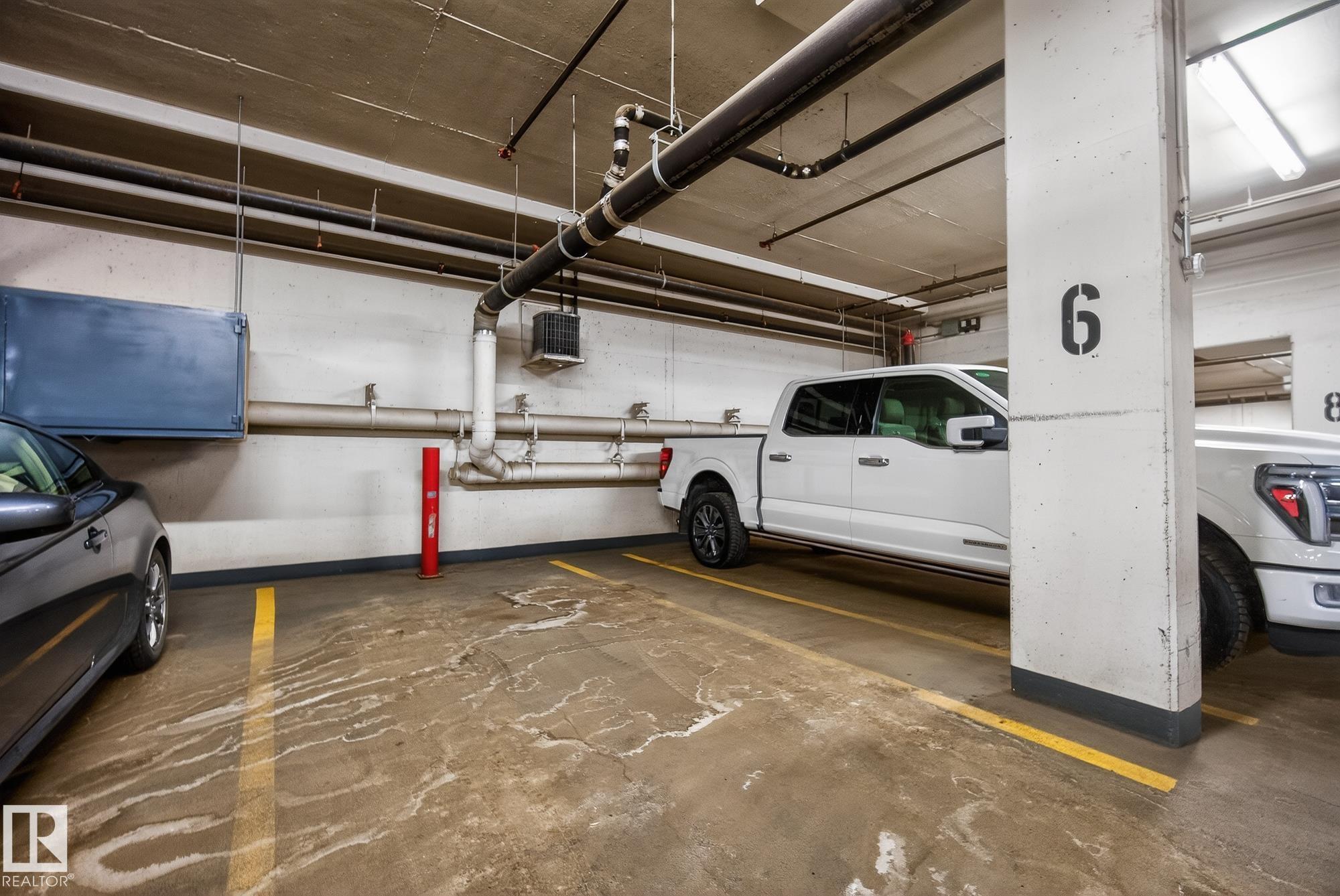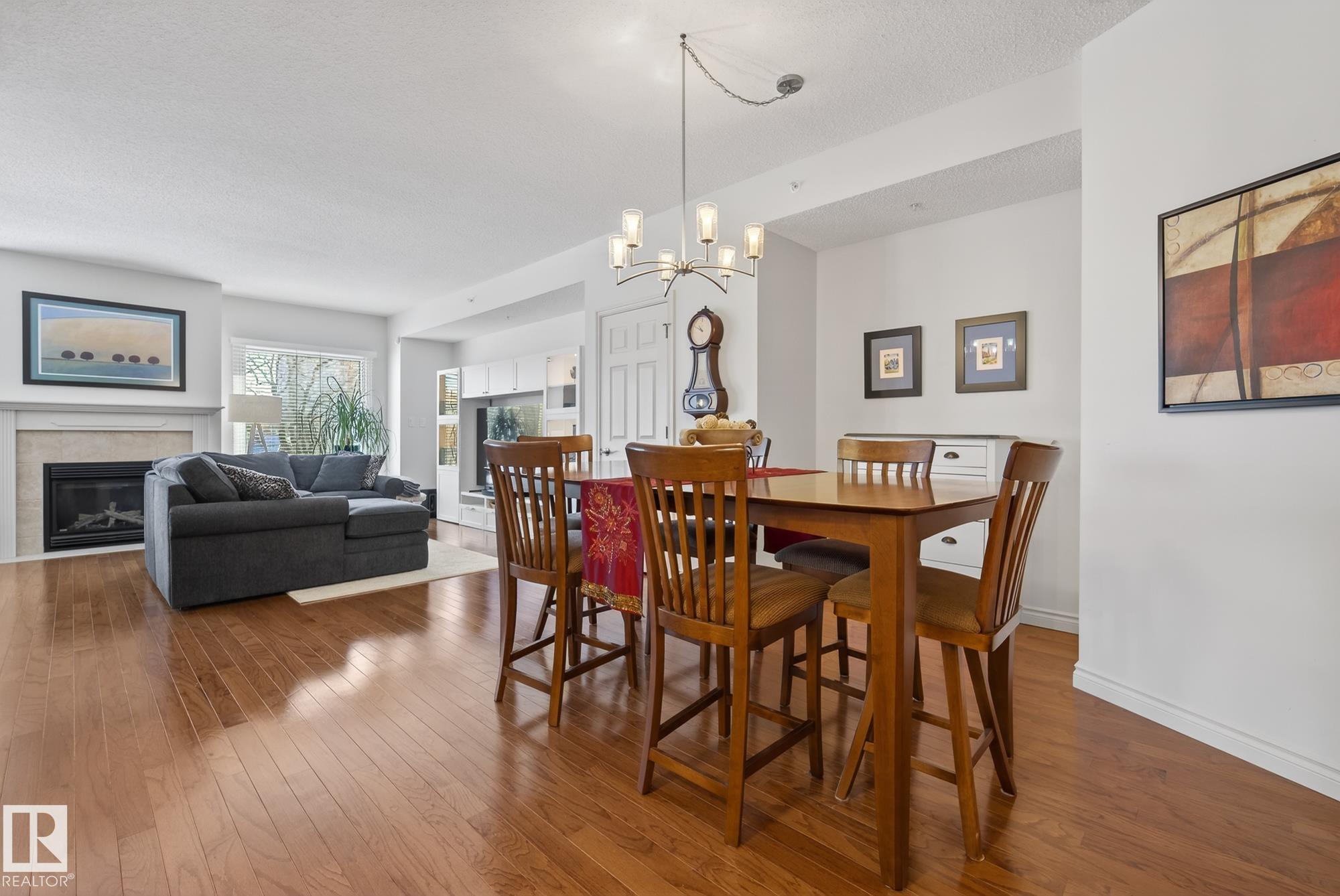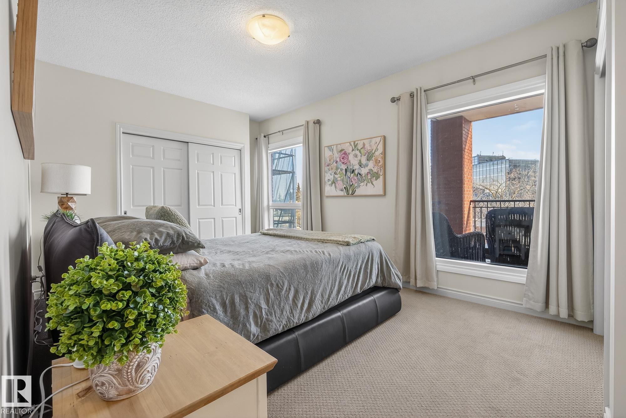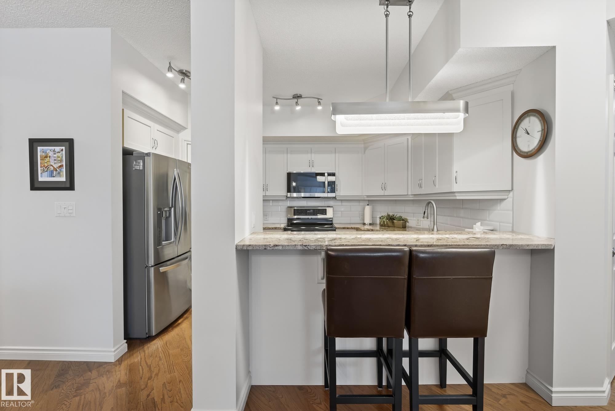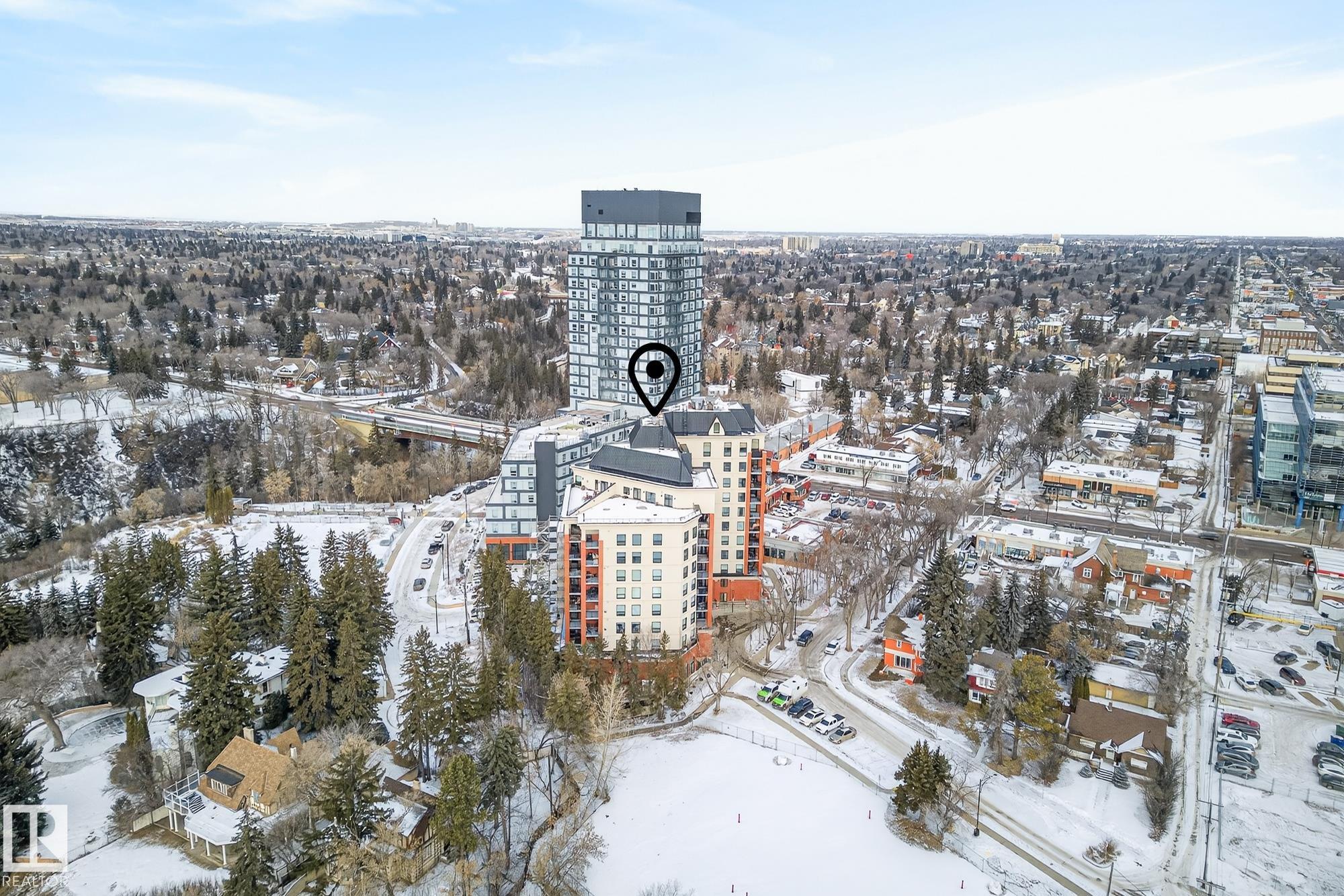 Steps from the River Valley and vibrant 124 Street, welcome to Properties on High Street--one of Edmonton's most sought-after downtown condo buildings. This bright and spacious 1,380 sq. ft. east-facing corner unit offers 2 bedrooms and 2 bathrooms with beautiful views of tree-lined streets and the downtown skyline. Large windows fill the home with natural light, complementing the 9 ft. ceilings, hardwood and tile flooring, and cozy gas fireplace. The beautifully finished kitchen features granite countertops, classic white shaker cabinetry, and eat-up bar. The generous primary suite includes a spacious ensuite, while the second bedroom is ideal for guests or a home office. Enjoy central air conditioning and relaxing or entertaining on the private covered balcony with gas BBQ hookup. This well-managed, pet-friendly building offers an exercise room, courtyard patio, onsite caretaker, and heated underground parking. A rare opportunity to enjoy spacious downtown living in a premier location.