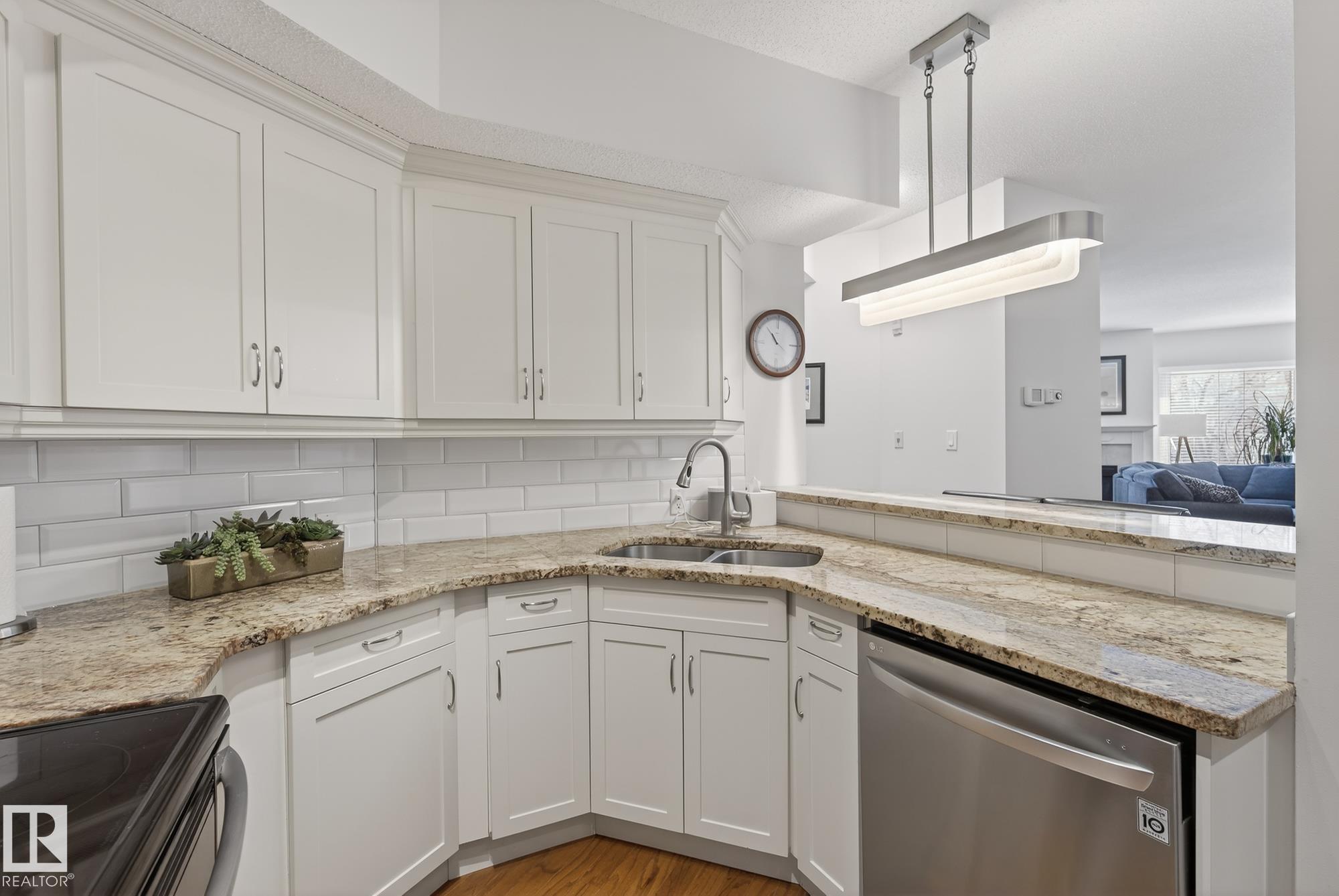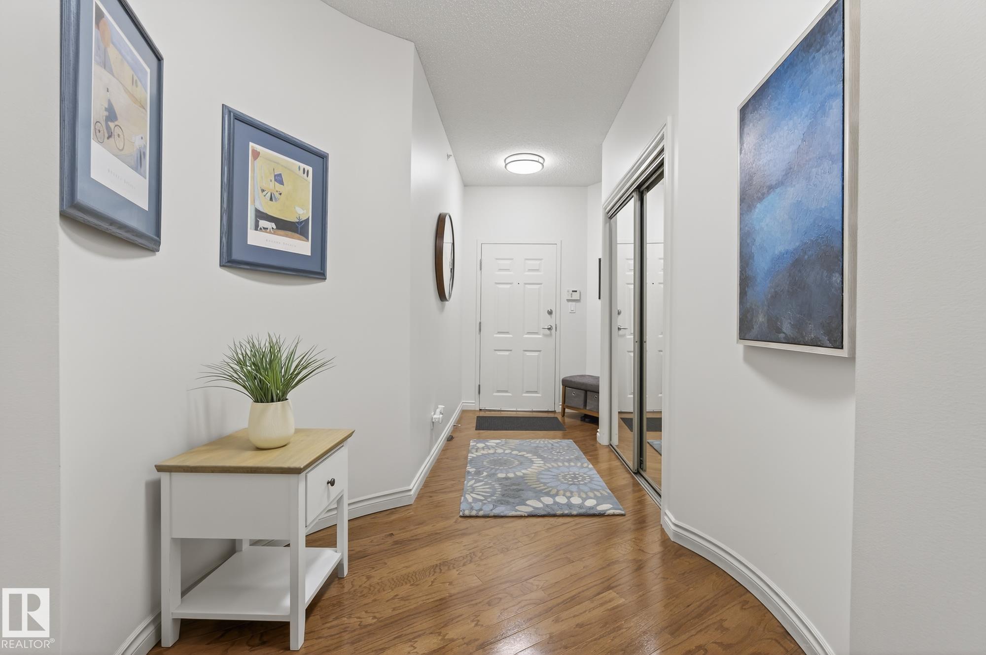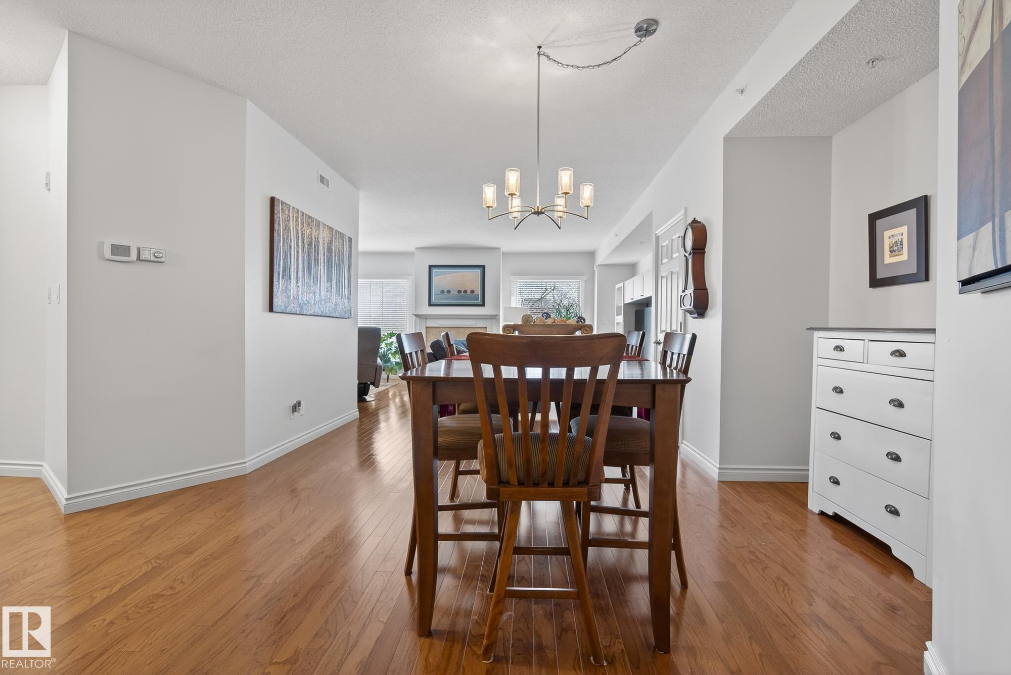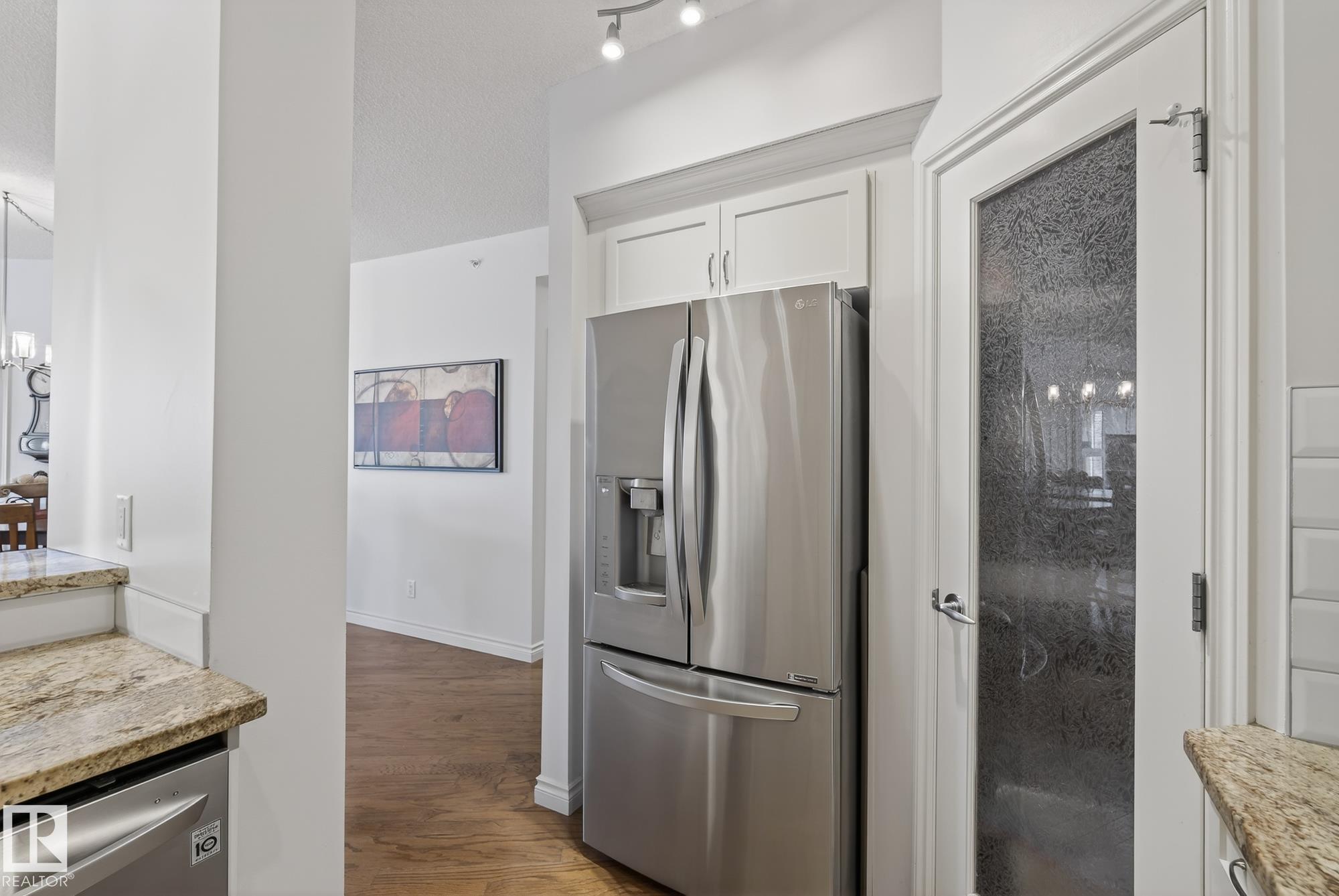 Steps from the River Valley and vibrant 124 Street, welcome to Properties on High Street--one of Edmonton's most sought-after downtown condo buildings. This bright and spacious 1,380 sq. ft. east-facing corner unit offers 2 bedrooms and 2 bathrooms with beautiful views of tree-lined streets and the downtown skyline. Large windows fill the home with natural light, complementing the 9 ft. ceilings, hardwood and tile flooring, and cozy gas fireplace. The beautifully finished kitchen features granite countertops, classic white shaker cabinetry, and eat-up bar. The generous primary suite includes a spacious ensuite, while the second bedroom is ideal for guests or a home office. Enjoy central air conditioning and relaxing or entertaining on the private covered balcony with gas BBQ hookup. This well-managed, pet-friendly building offers an exercise room, courtyard patio, onsite caretaker, and heated underground parking. A rare opportunity to enjoy spacious downtown living in a premier location.