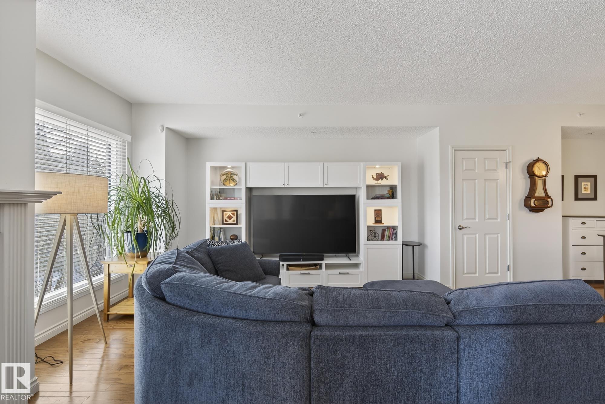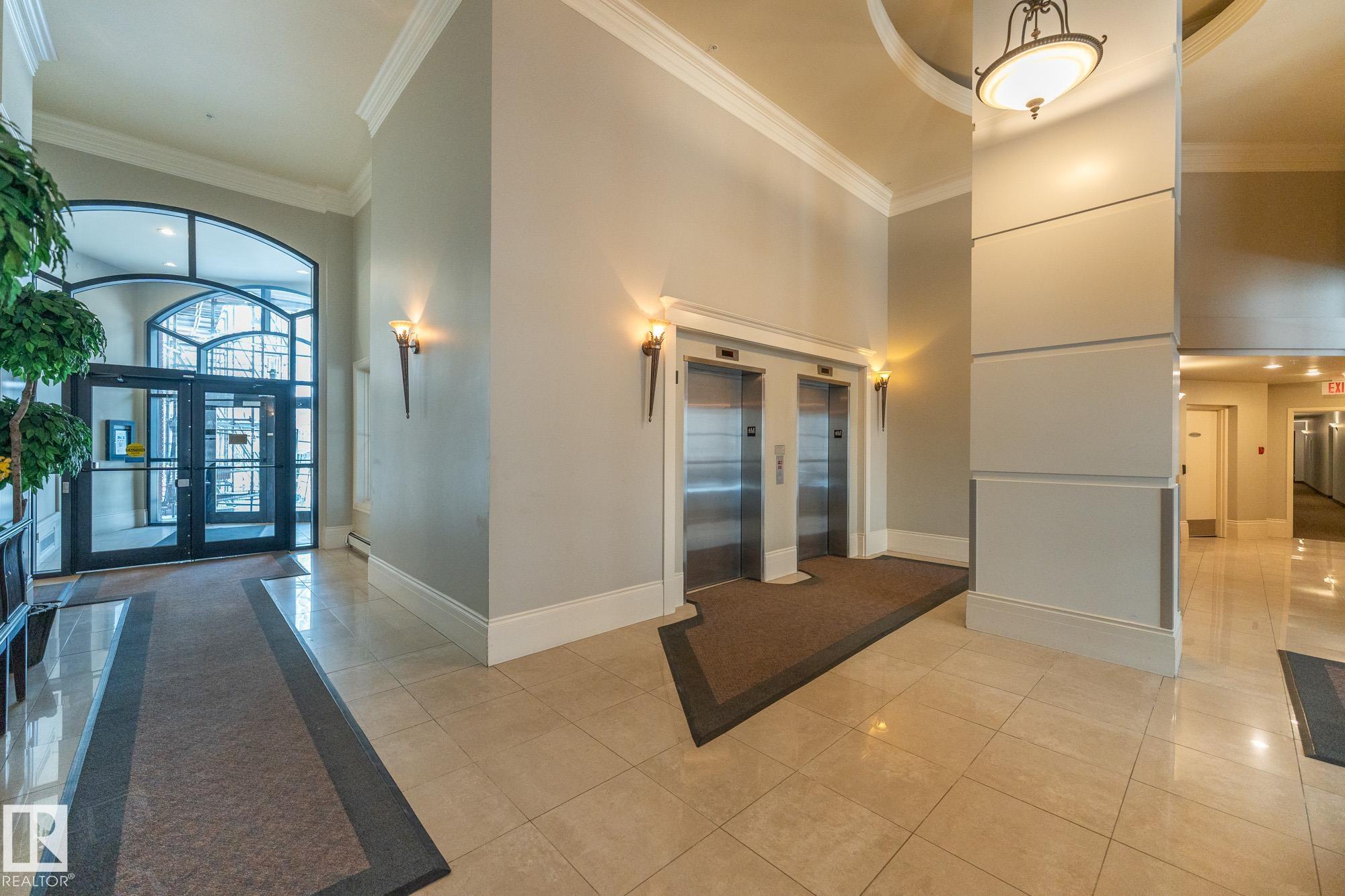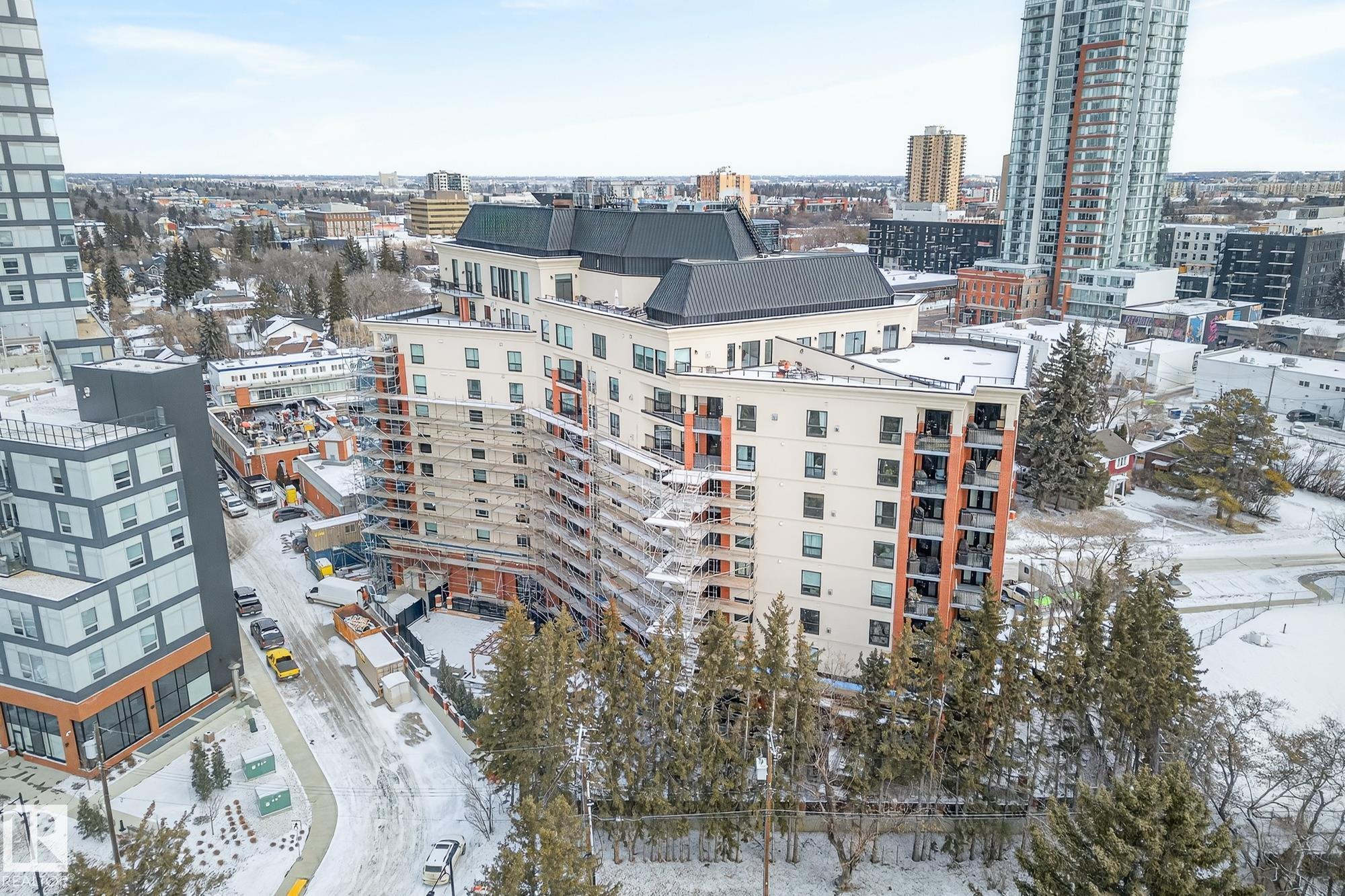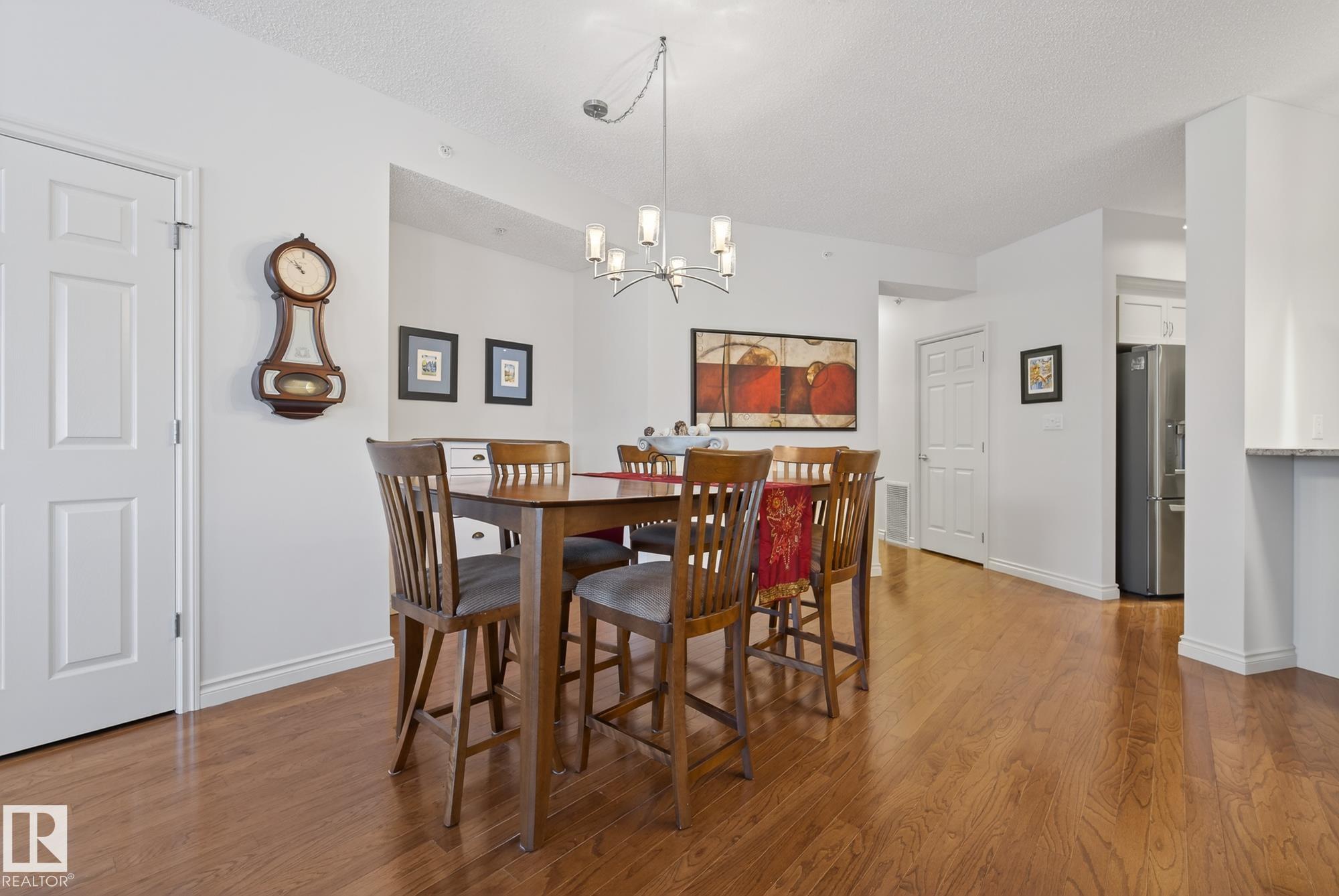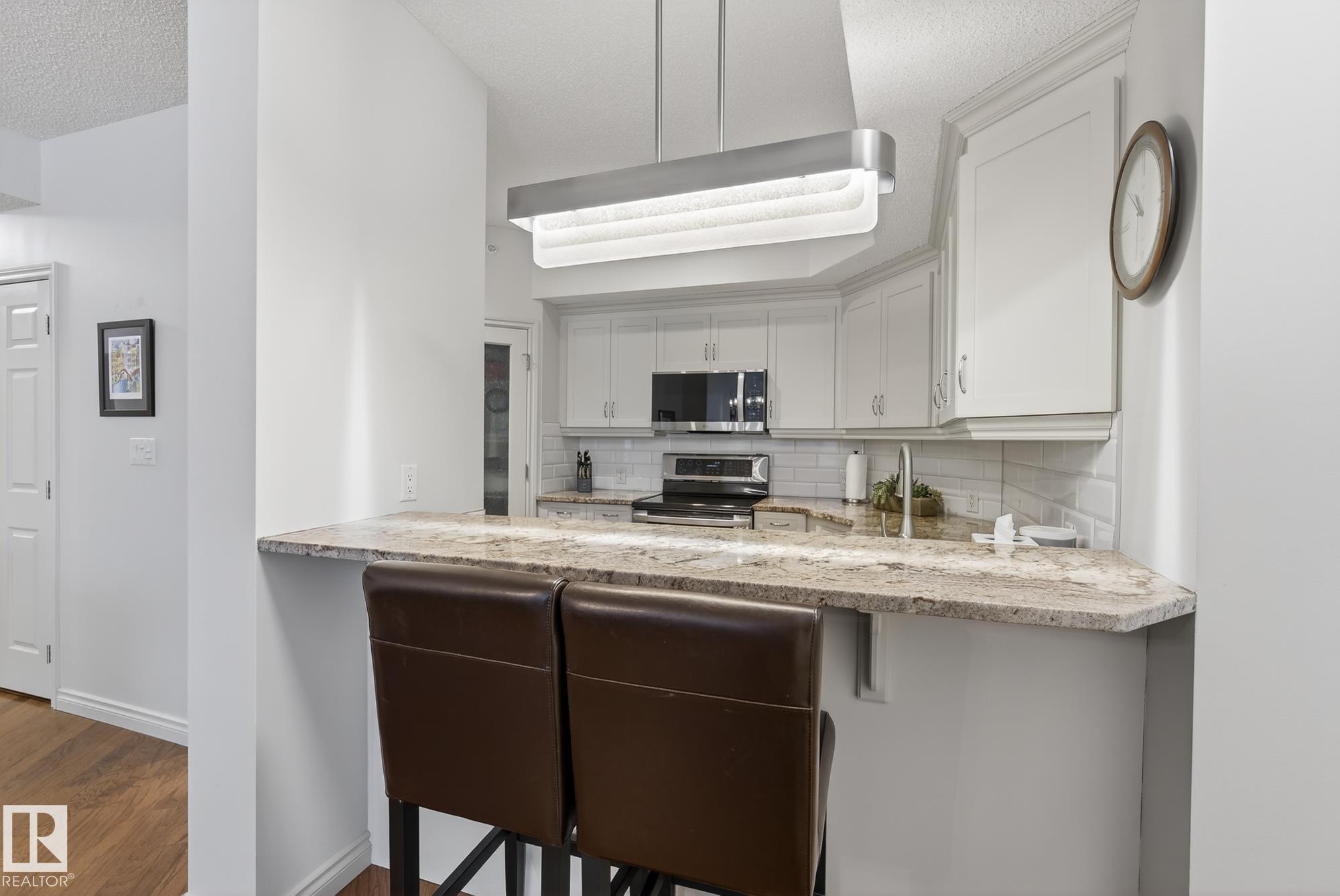 Steps from the River Valley and vibrant 124 Street, welcome to Properties on High Street--one of Edmonton's most sought-after downtown condo buildings. This bright and spacious 1,380 sq. ft. east-facing corner unit offers 2 bedrooms and 2 bathrooms with beautiful views of tree-lined streets and the downtown skyline. Large windows fill the home with natural light, complementing the 9 ft. ceilings, hardwood and tile flooring, and cozy gas fireplace. The beautifully finished kitchen features granite countertops, classic white shaker cabinetry, and eat-up bar. The generous primary suite includes a spacious ensuite, while the second bedroom is ideal for guests or a home office. Enjoy central air conditioning and relaxing or entertaining on the private covered balcony with gas BBQ hookup. This well-managed, pet-friendly building offers an exercise room, courtyard patio, onsite caretaker, and heated underground parking. A rare opportunity to enjoy spacious downtown living in a premier location.