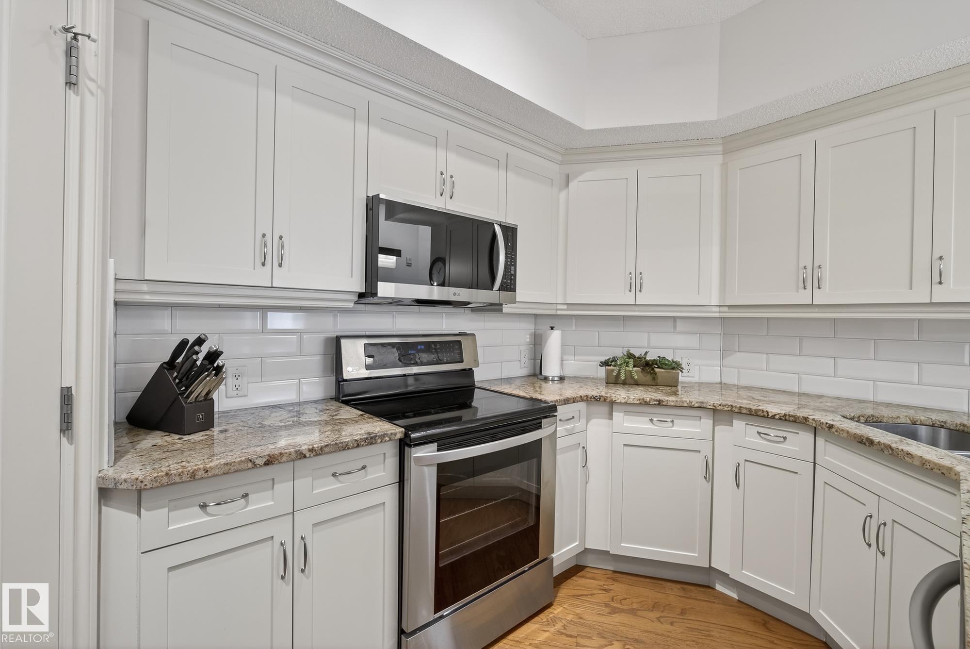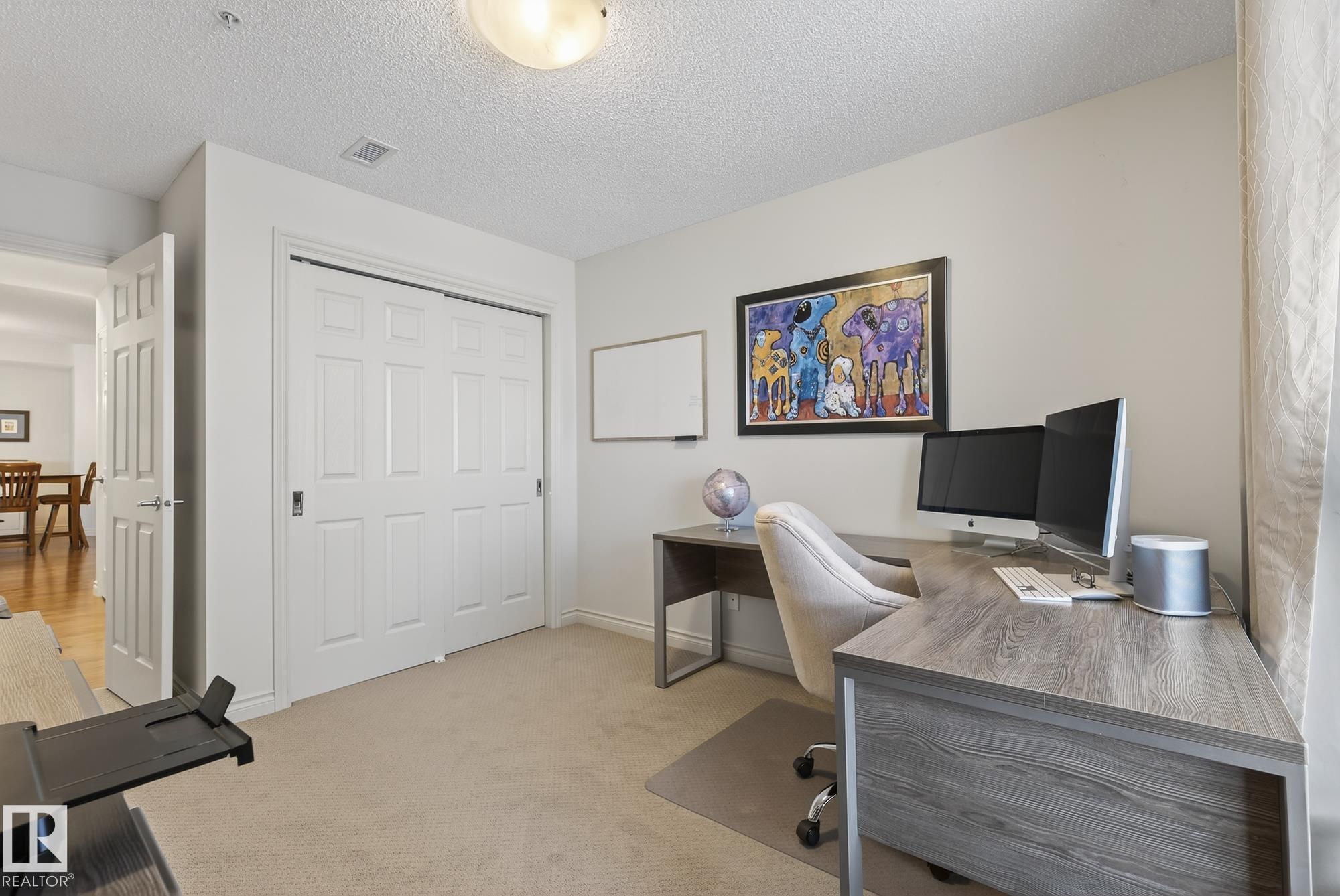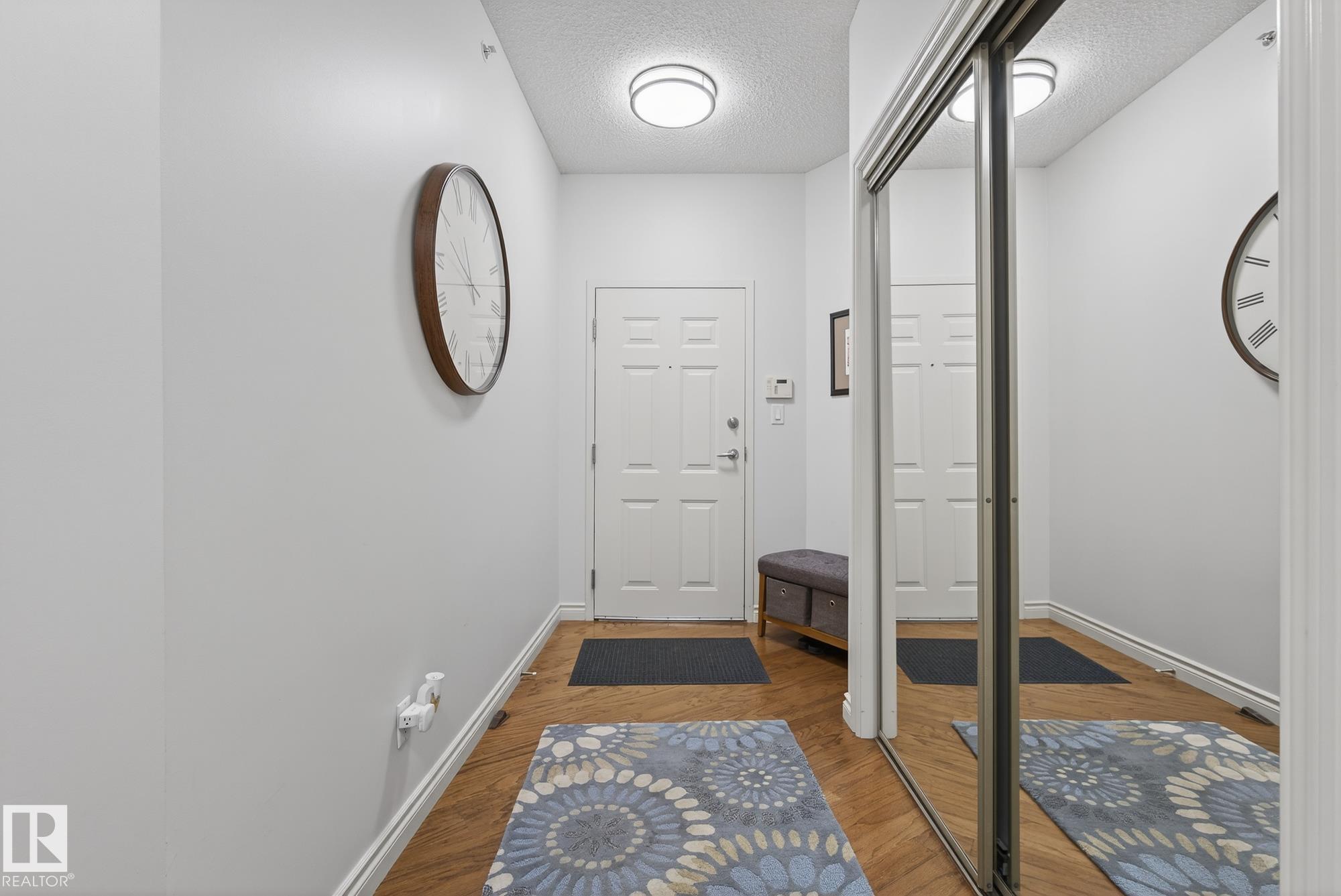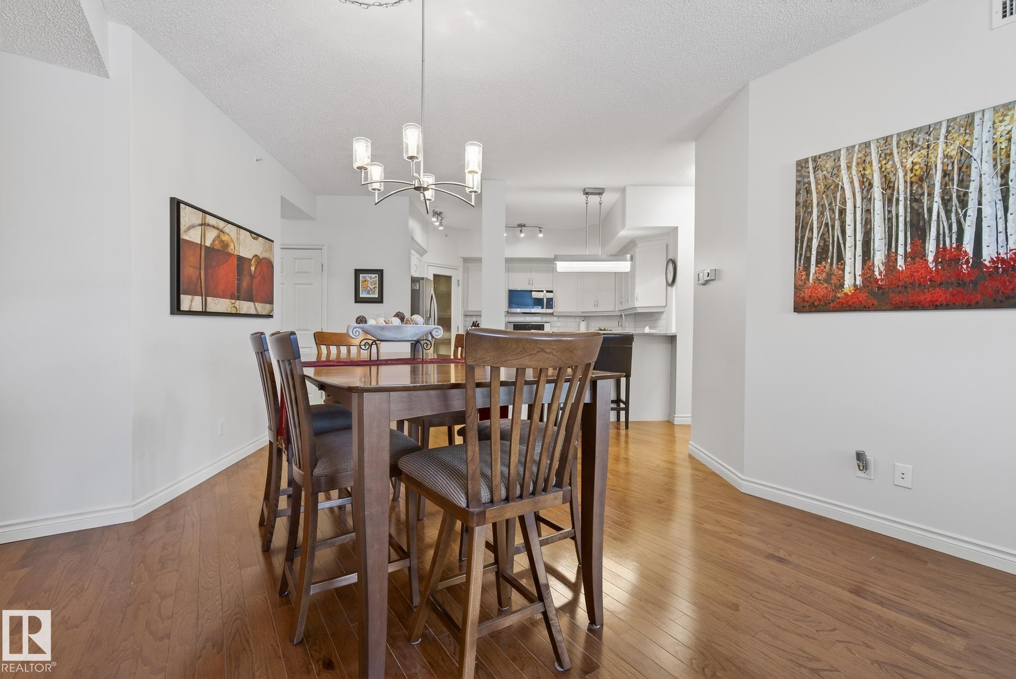 Steps from the River Valley and vibrant 124 Street, welcome to Properties on High Street--one of Edmonton's most sought-after downtown condo buildings. This bright and spacious 1,380 sq. ft. east-facing corner unit offers 2 bedrooms and 2 bathrooms with beautiful views of tree-lined streets and the downtown skyline. Large windows fill the home with natural light, complementing the 9 ft. ceilings, hardwood and tile flooring, and cozy gas fireplace. The beautifully finished kitchen features granite countertops, classic white shaker cabinetry, and eat-up bar. The generous primary suite includes a spacious ensuite, while the second bedroom is ideal for guests or a home office. Enjoy central air conditioning and relaxing or entertaining on the private covered balcony with gas BBQ hookup. This well-managed, pet-friendly building offers an exercise room, courtyard patio, onsite caretaker, and heated underground parking. A rare opportunity to enjoy spacious downtown living in a premier location.