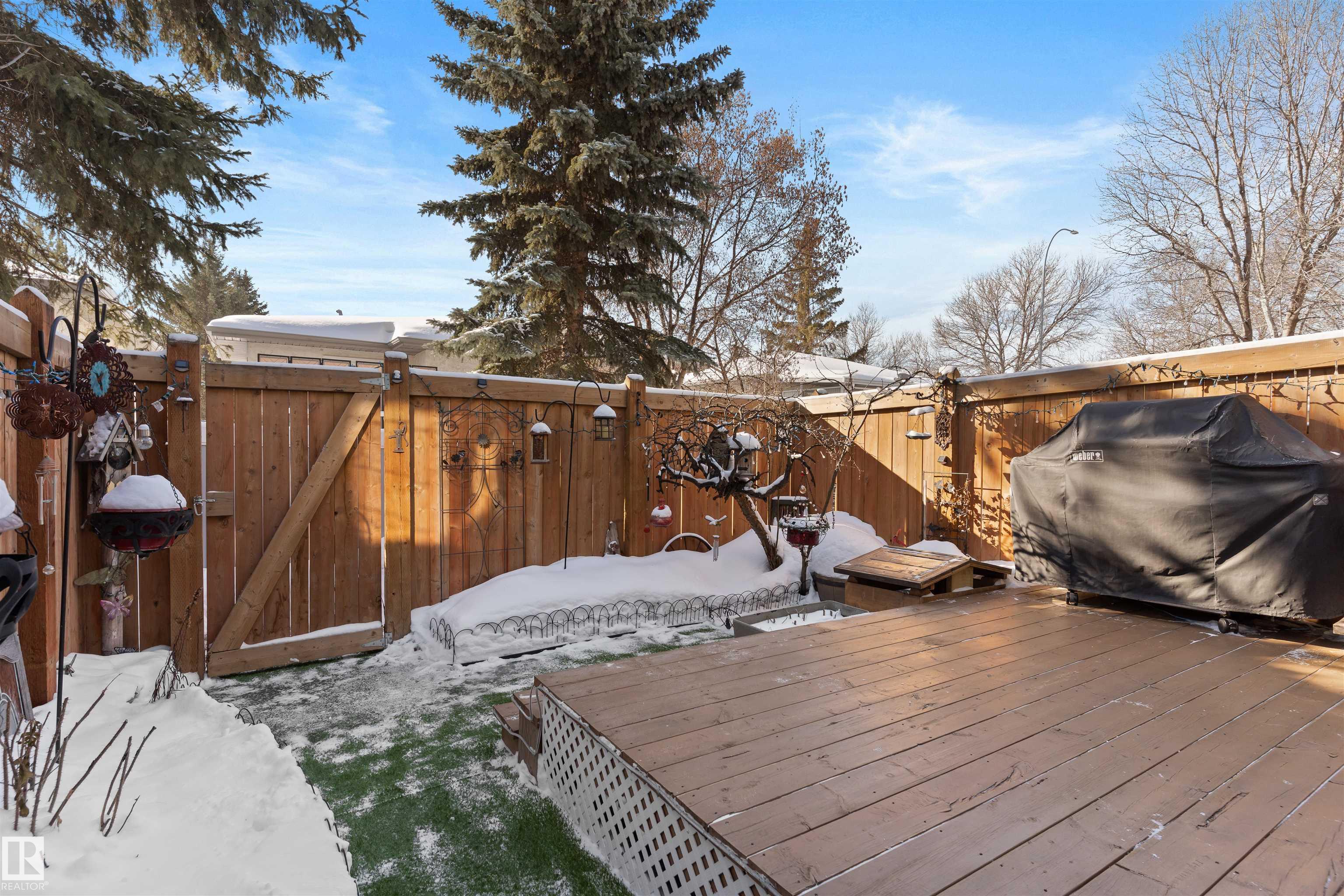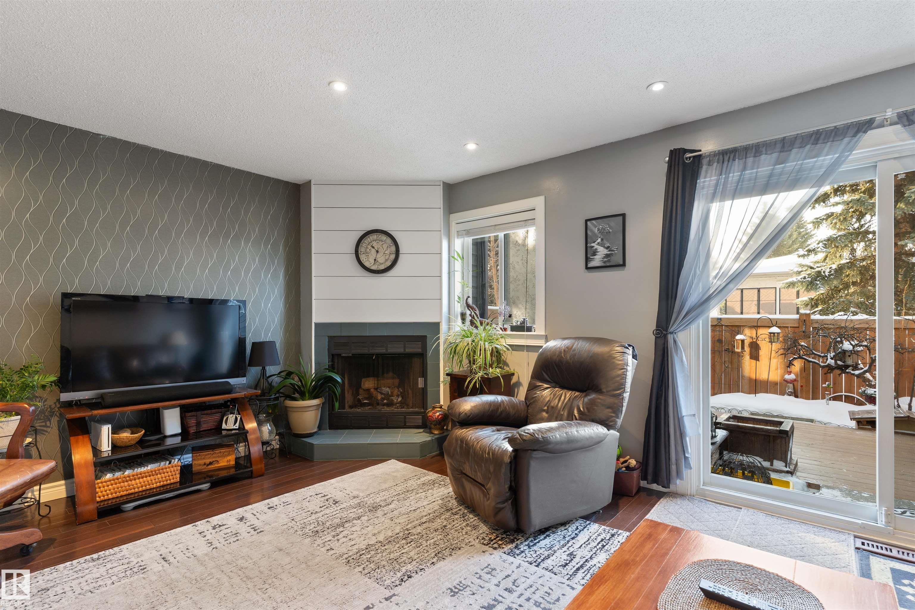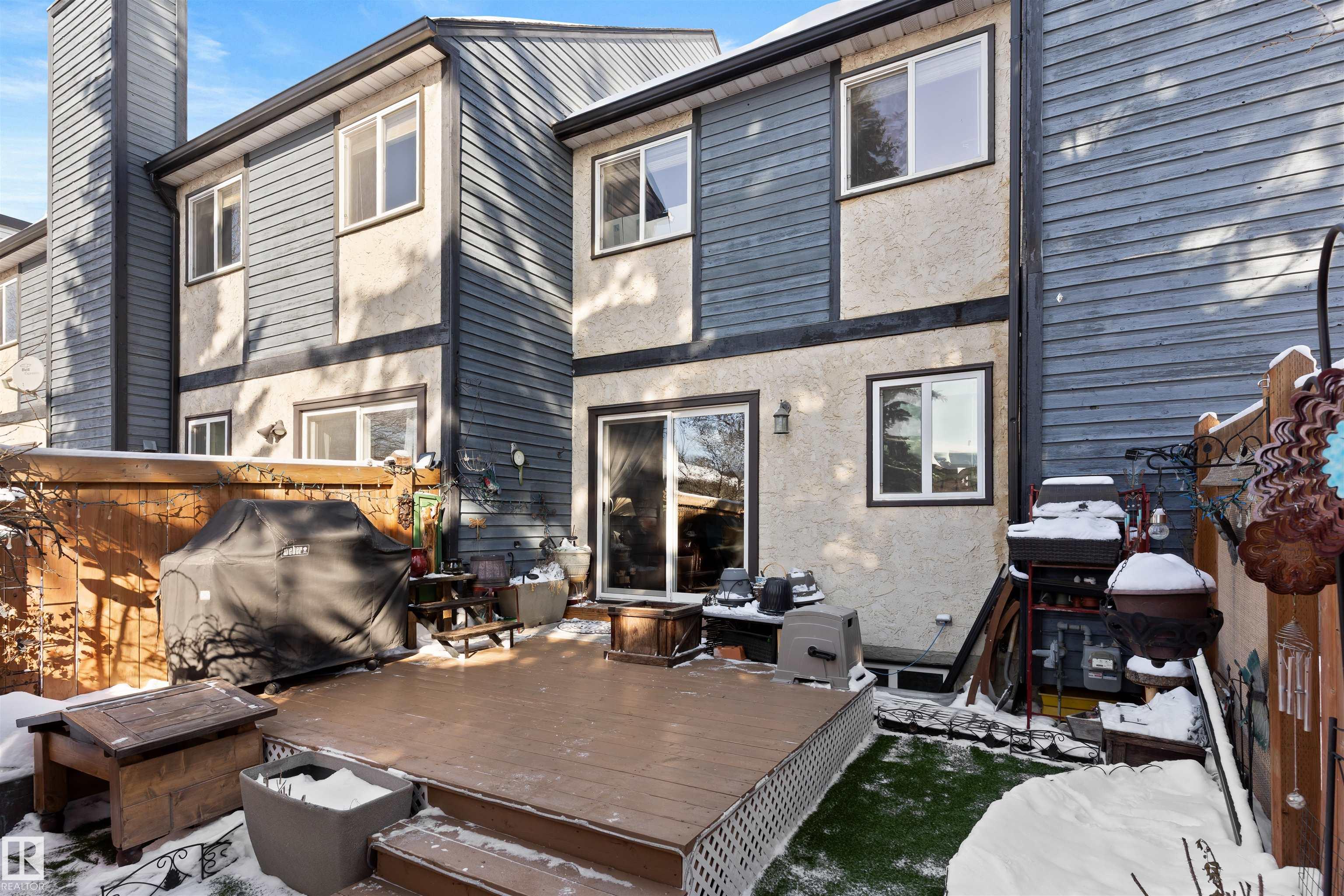 Welcome to this meticulously maintained two-story townhome nestled in the sought-after community of Grandin. Upon entering this charming home, you are greeted by a warm and inviting layout. The kitchen features two-tone cabinetry, a double oven for all your cooking needs, and a new stainless steel fridge. The spacious living room features a wood-burning fireplace and patio doors that lead to a spacious deck and fully fenced yard, complete with low-maintenance astroturf. Upstairs, you'll find three spacious bedrooms. The primary includes a cozy nook and a private balcony. The bathroom is finished with a rain shower for a spa-like touch. The basement provides plenty of storage, laundry, and a versatile flex space, perfect for guests or entertaining. Enjoy two powered parking stalls conveniently located directly in front of the unit. This well-maintained complex is situated close to parks, walking trails, and amenities, with quick access to Anthony Henday and 170th Street.
