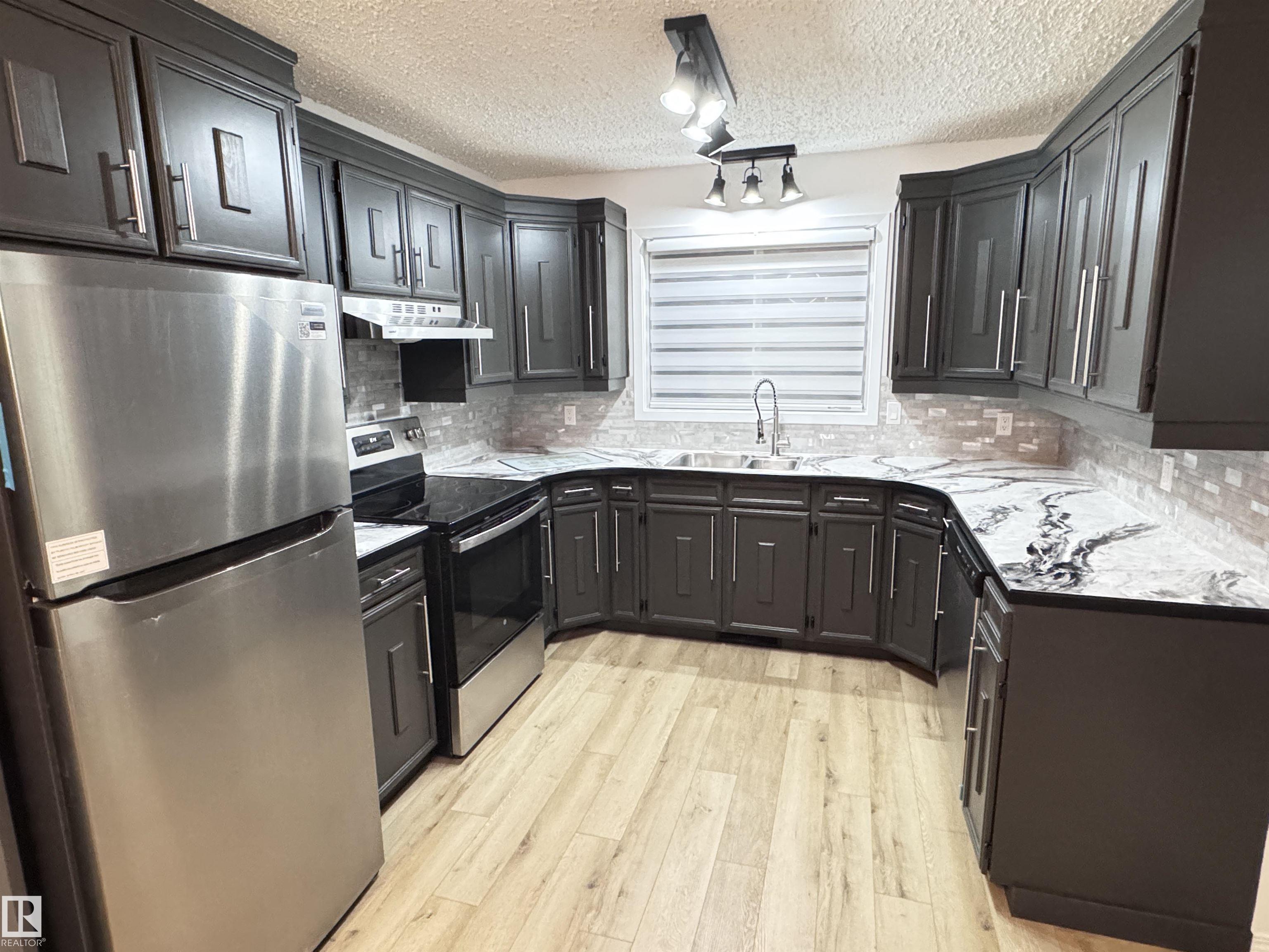 Beautifully renovated 1220 sq ft bungalow offering 3+3 bedrooms, 3 bathrooms, in a quiet cul-de-sac, walking distance to schools and amenities. Enjoy a bright, open-concept layout with a cozy living room featuring a fireplace with log lighter. Updates include a high-efficiency furnace, luxury vinyl plank flooring, new carpet, fresh interior paint, refinished countertops and cabinetry, and new sleek stainless steel appliances. The primary bedroom boasts a 2-pc ensuite, complemented by a full main bath. Featuring a spacious laundry room, and a fully finished basement with abundant natural light. Generous front and rear entries, newer shingles, closet organizers in most bedrooms, and includes 5 appliances. Brick and stucco exterior with capped windows for low maintenance, front drive access, single-detached 11'x24' garage, and storage shed. Nearly every detail has been thoughtfully refreshed--move-in ready!